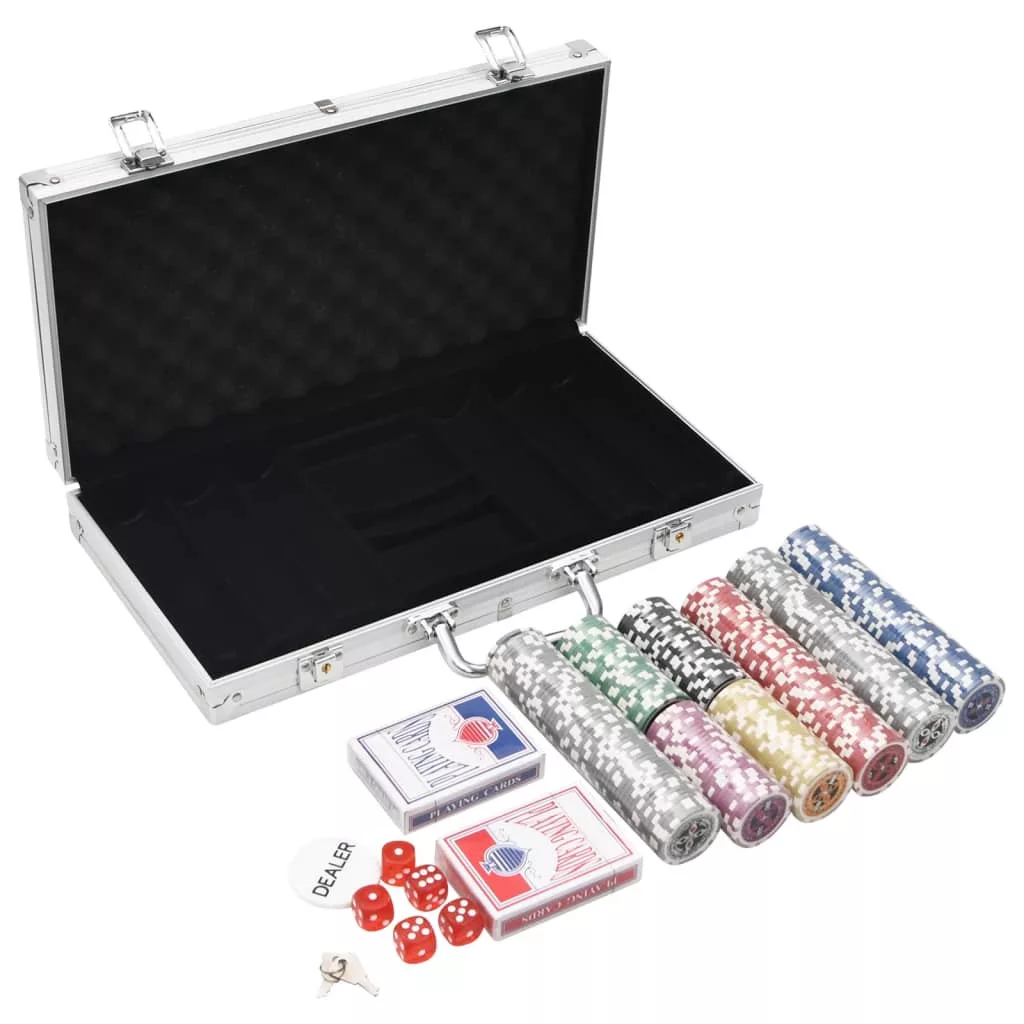 - Professzionális pókerkészlet: Ez a készlet 5 pókerkockát, 2 kártyapaklit, 1 osztó helyét jelölő korongot és 300 lézeres zsetont tartalmaz.