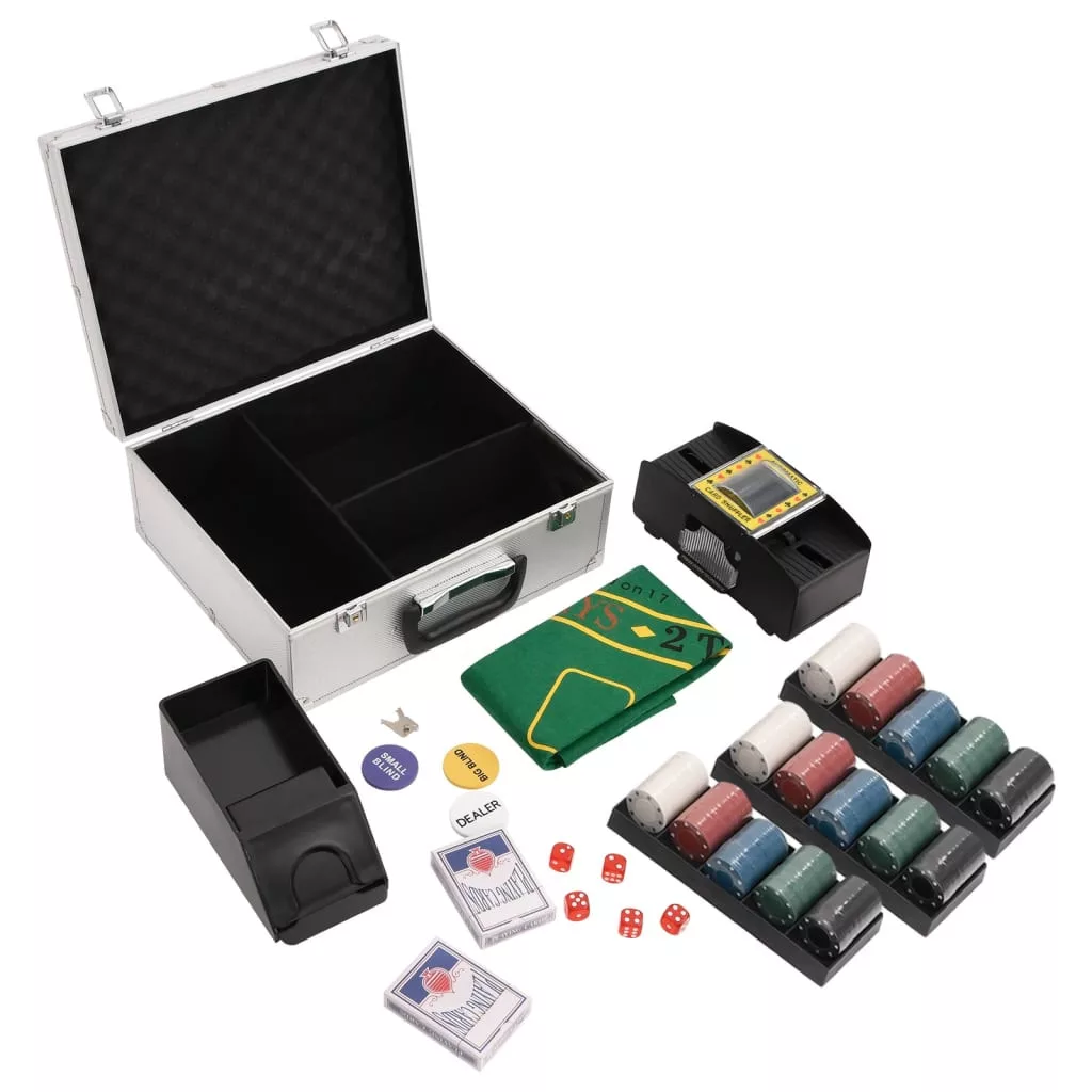 - Professzionális pókerkészlet: Ez a készlet 5 pókerkockát, 1 paklitartót, 2 kártyapaklit, 3 zsetontartót, 1 automatikus kártyakeverőt, 1 pókerasztalt, 1 osztót jelölő korongot, 1 kisvak licitkorongot, 1 nagyvak licitkorongot és 300 zsetont tartalmaz.