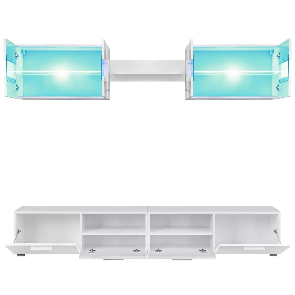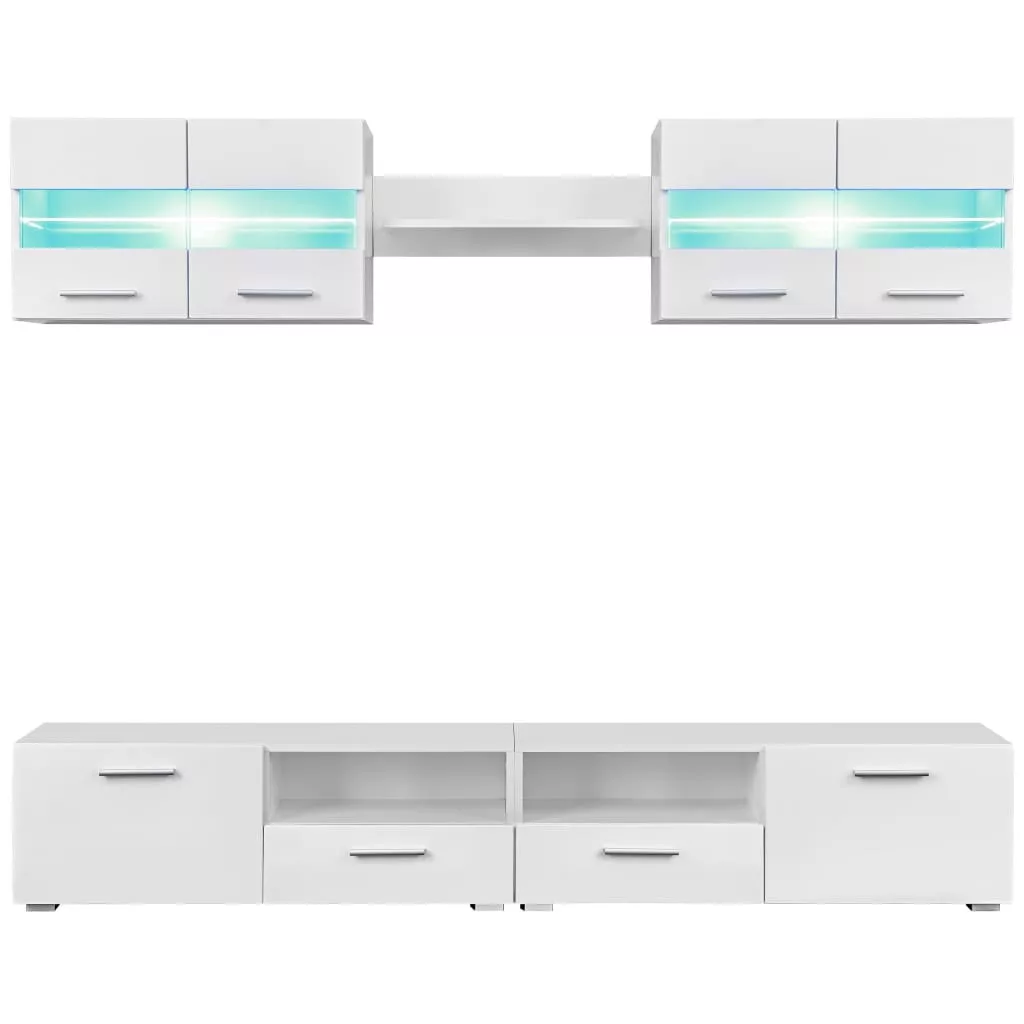 A szett két faliszekrényt, egy polcot és egy TV-állványt tartalmaz, mely 2 szekrényből áll, így a bútor elegendő helyet biztosít multimédiás készülékei, DVD-lejátszója, médiahordozói, könyvei és egyéb kisebb tárgyai számára. Emellett dísztárgyakat, fényképeket vagy cserepes növényeket is elhelyezhet rajta. Mindegyik faliszekrény egy üvegpolccal van ellátva, melyeken energiatakarékos LED-fények találhatók, így elbűvölő hangulatot varázsol otthonába. A TV-szekrények lefelé nyíló ajtókkal vannak felszerelve.