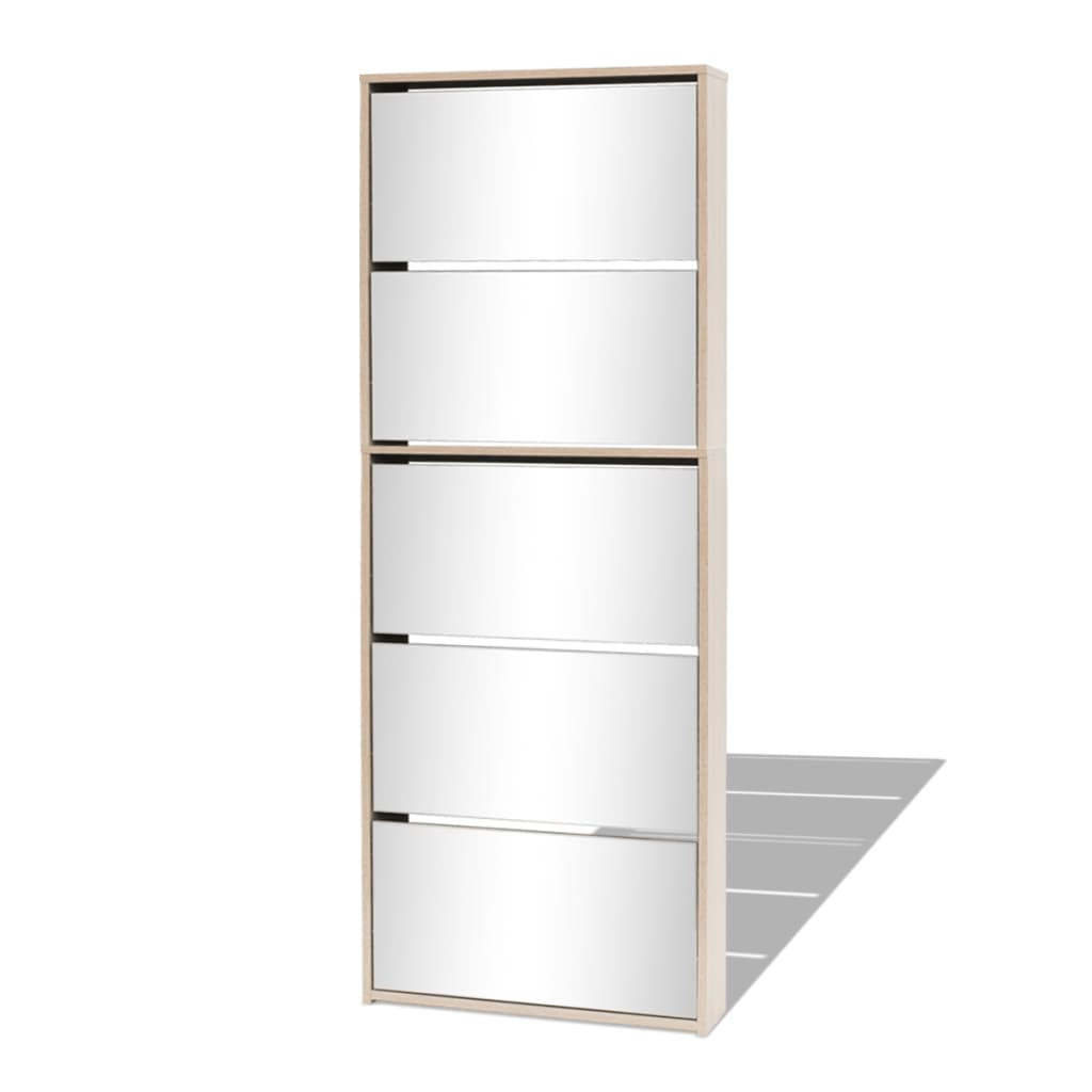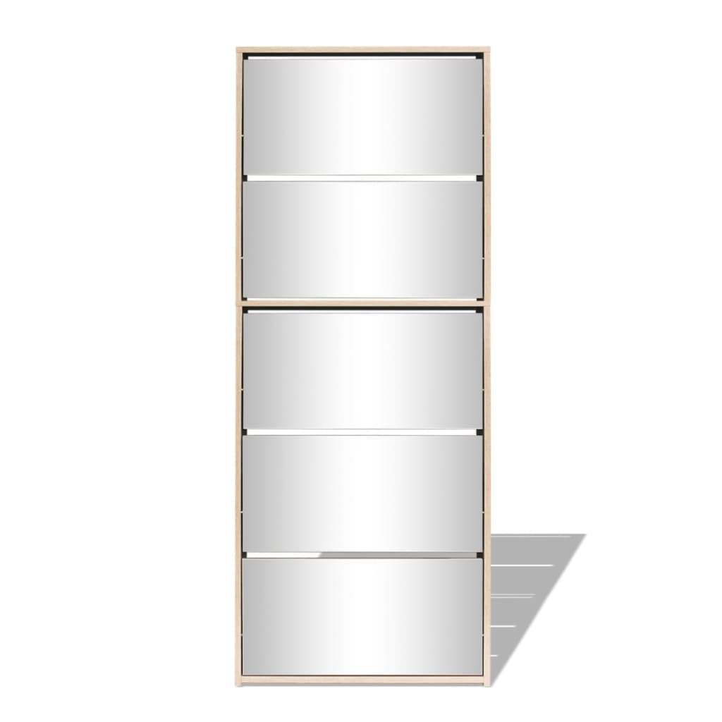 A tükrözött cipőszekrénynek 5 lehúzható fiókja van, amelyek mindegyike 3-4 cipőpárt képes tárolni. A cipőtartó közvetlenül a falhoz rögzíthető. Ez az erős és tartós előszoba szekrény kiváló minőségű anyagból készült, így rendkívül praktikus helyet biztosít a cipők stílusos és rendezett tárolására.