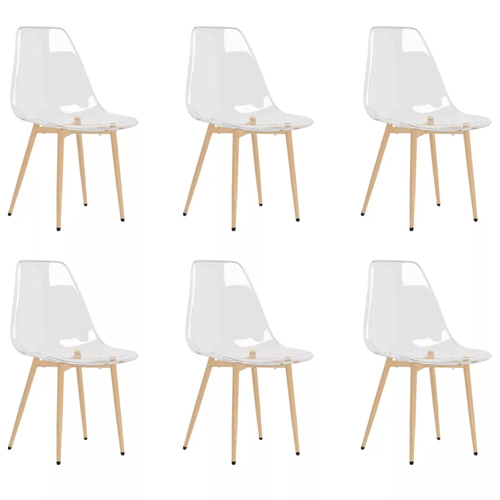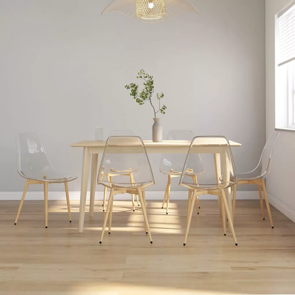 Az étkezőszék átlátszó ülőfelülete sima vonalakkal rendelkezik, amelyek különleges megjelenést kölcsönöznek neki. Ezek az étkezőszékek PET-ből készültek, így könnyen tisztíthatók. Ezenkívül a fémlábak extra stabilitást kölcsönöznek a konyhai székeknek. Az ergonomikusan ívelt háttámlával kialakított szék a lehető legjobb kényelmet biztosítja. Eközben a lábpárnák megakadályozzák a padló karcolódását, valamint további stabilitást nyújtanak.