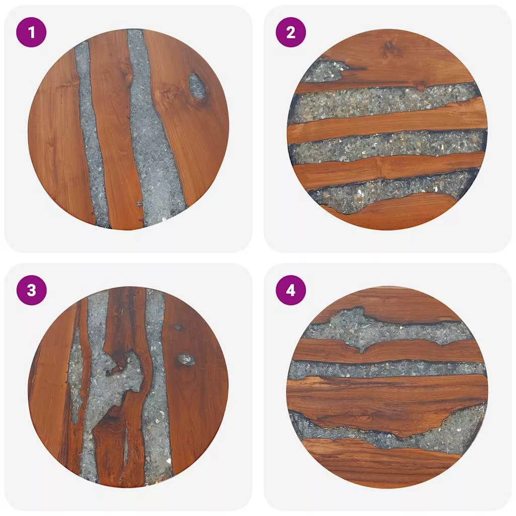 Ez a tömör tikfából és mangófából készült, átlátszó gyantázott felületű, egyedi dohányzóasztal rusztikus bájával igazán szemet gyönyörködtető. A kör alakú asztallap stabil és biztonságos felületet biztosít, amelyen italokat, vázákat, gyümölcsös tálakat vagy díszeket lehet elhelyezni. A dohányzóasztal kisasztalként is használható.