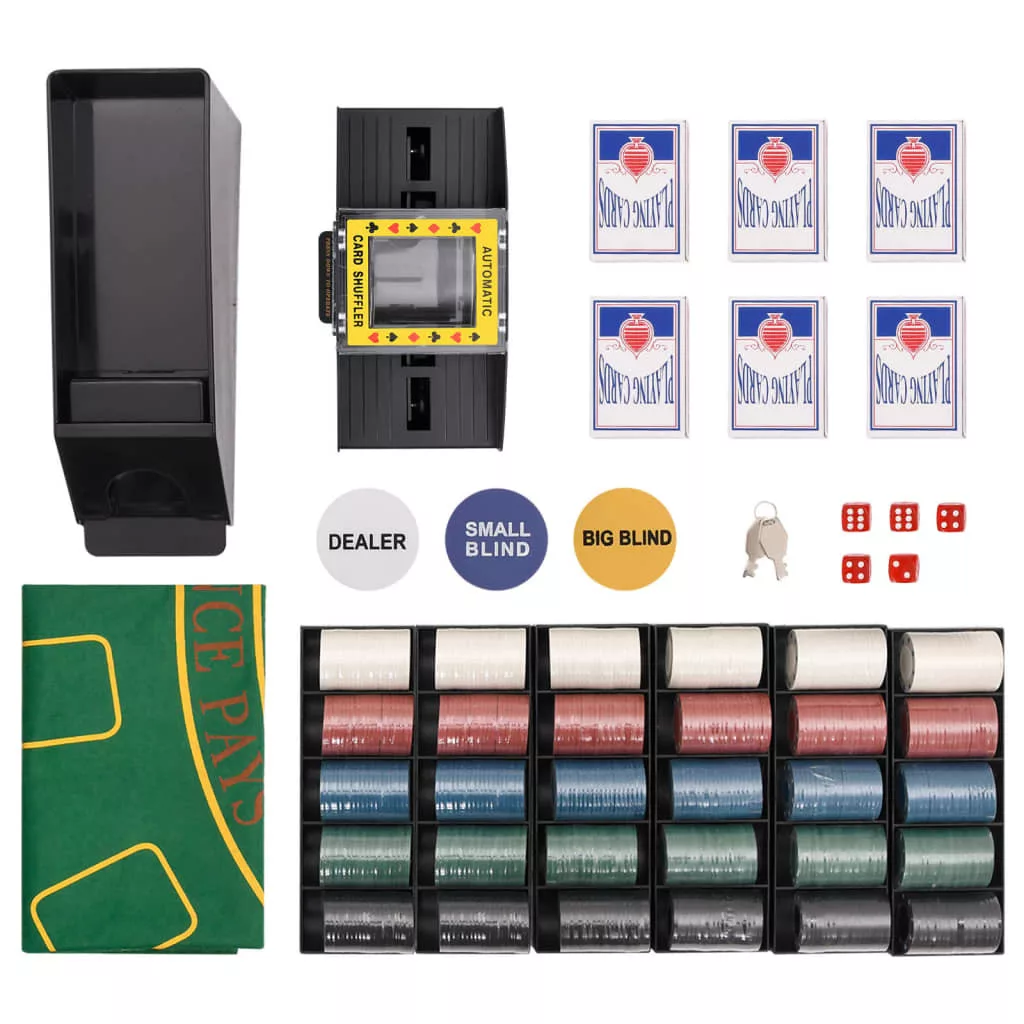 - Professzionális pókerkészlet: Ez a készlet 5 pókerkockát, 1 paklitartót, 6 kártyapaklit, 6 zsetontartót, 1 automatikus kártyakeverőt, 1 pókerasztalt, 1 osztót jelölő korongot, 1 kisvak licitkorongot, 1 nagyvak licitkorongot és 600 zsetont tartalmaz.