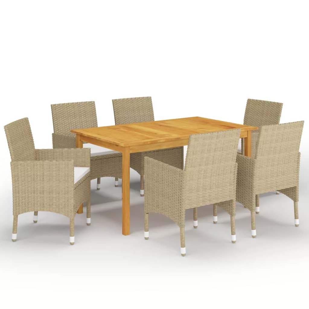 Az étkezőasztal olajbevonatú, tömör akácfából készült, így stabil, tartós és könnyen karbantartható. A porszórt acélváz időjárásálló polyrattan burkolattal lett ellátva, ezért az étkezőszékek strapabíróak, valamint könnyen tisztíthatóak. Az ívelt háttámla és kartámasz még ergonomikusabbá varázsolja a székeket. Az ülésekhez kivehető, vastag párnák tartoznak, melyek növelik a kényelmet pihenés közben.