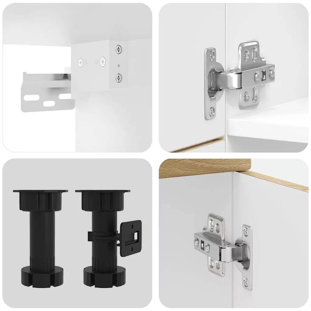 - Állítható lábak: Az alsó szekrények állítható lábakkal rendelkeznek, amelyek magassága a konyha elrendezéséhez igazítható.