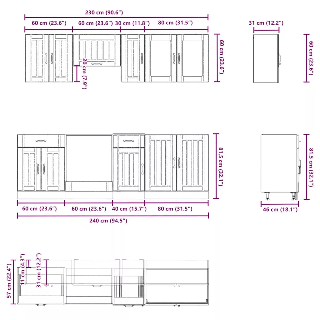 - Bőséges tárolóhely: A konyhaszekrény-garnitúra számos rekesszel rendelkezik, és elegendő helyet kínál tálak, tányérok, edények és egyéb konyhai eszközök tárolására.
