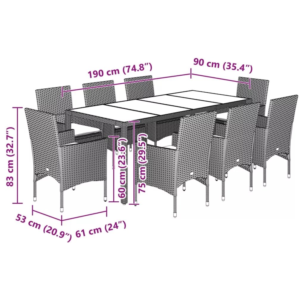 - Anyaga: polietilén rattan, porszórt acélváz, edzett üveg