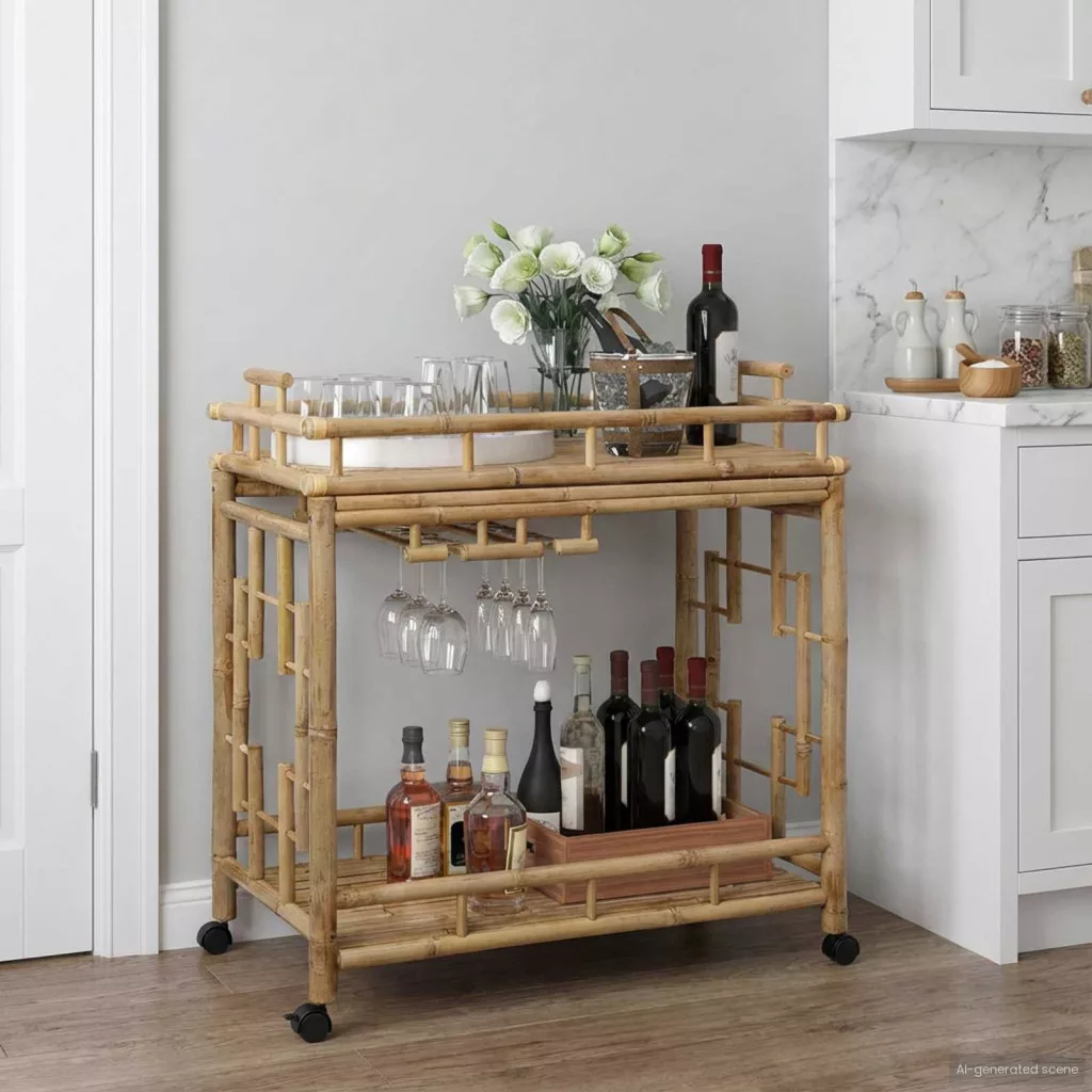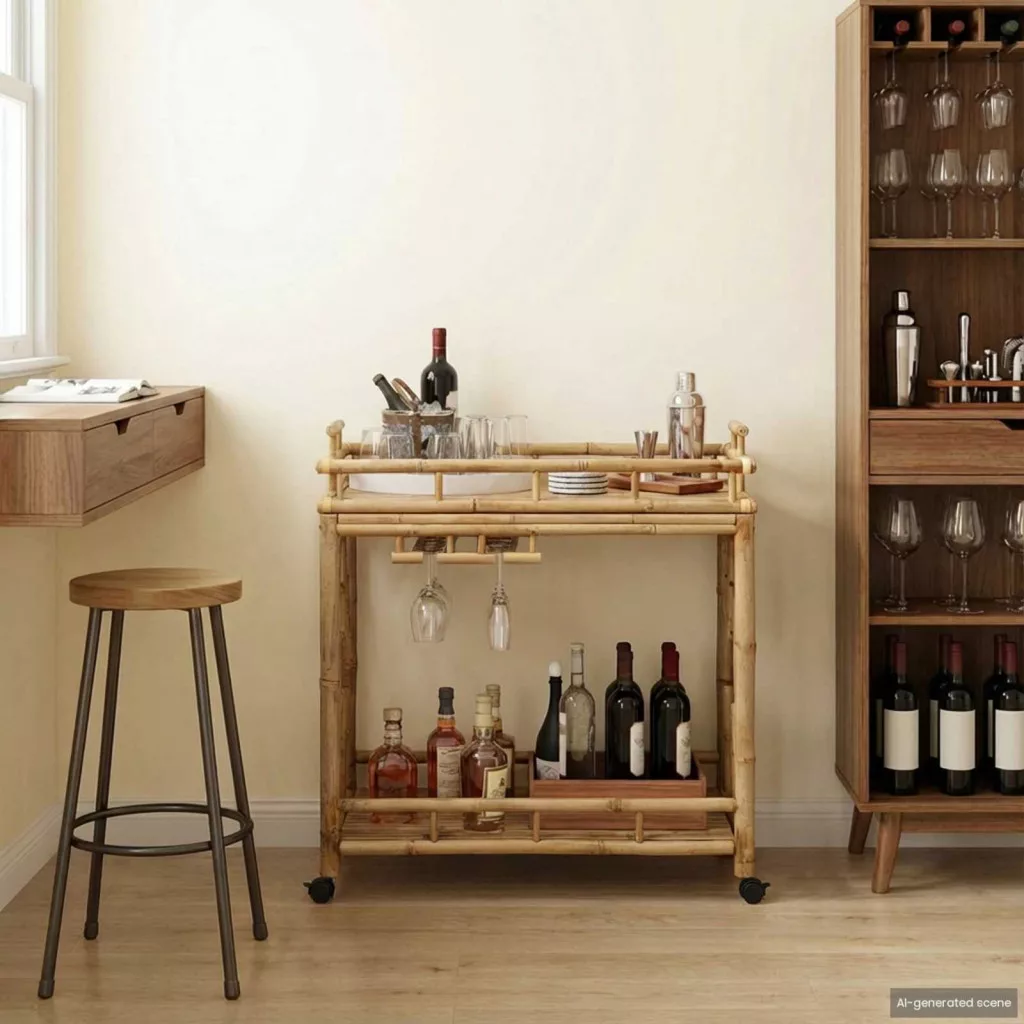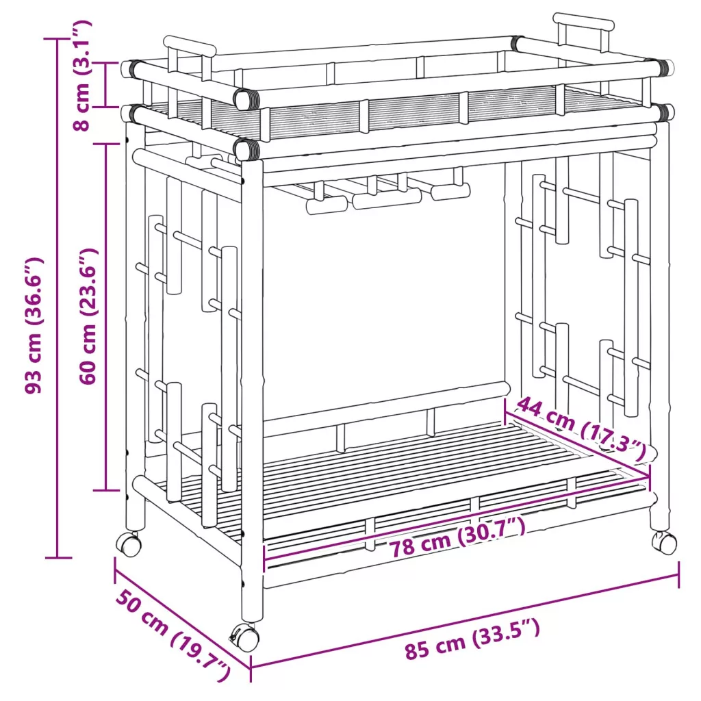 Ez a kerekes boroskocsi csúcsdizájn bármely belső térnek, kényelmes mozgást és egy kis eleganciát ad. Karcsú téglalap formája miatt könnyen beilleszthető a konyhákba és nappalikba, stílusos és praktikus módot kínál a kedvenc borok tárolására és tálalására. A bambusz anyag meleg árnyalata és könnyű felépítése ideális a helyezést könnyítő szórakoztatáshoz.