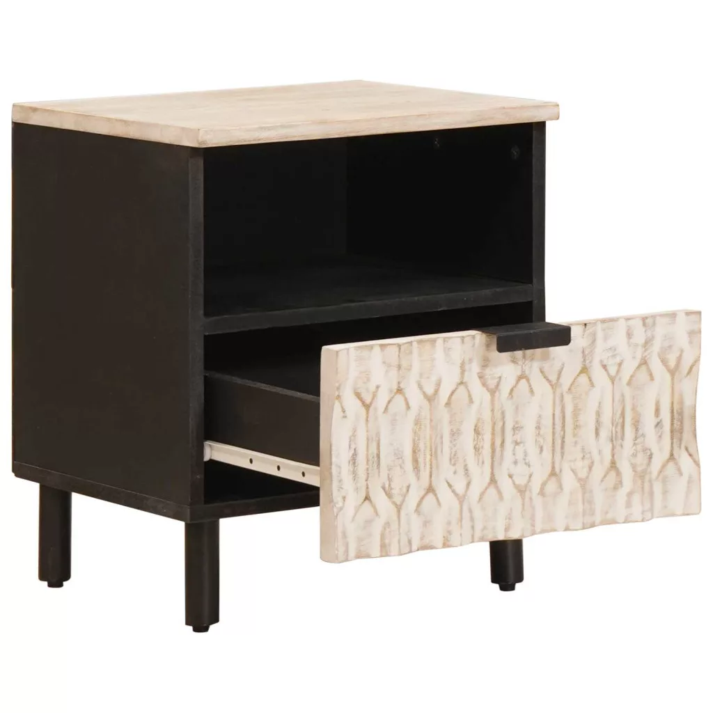 - Anyagok: Teljesen tömör mangófából készült, ez az éjjeli szekrény tartósságot és időtlen bájt kínál. A másodlagos elemekhez használt összeszerelt fák biztosítják a stabilitást, miközben a sima formát megőrzik, így beleillik különböző belső stílusokba. Az anyagok harmóniája megbízható és esztétikus darabot eredményez, ami szép lassan öregszik.