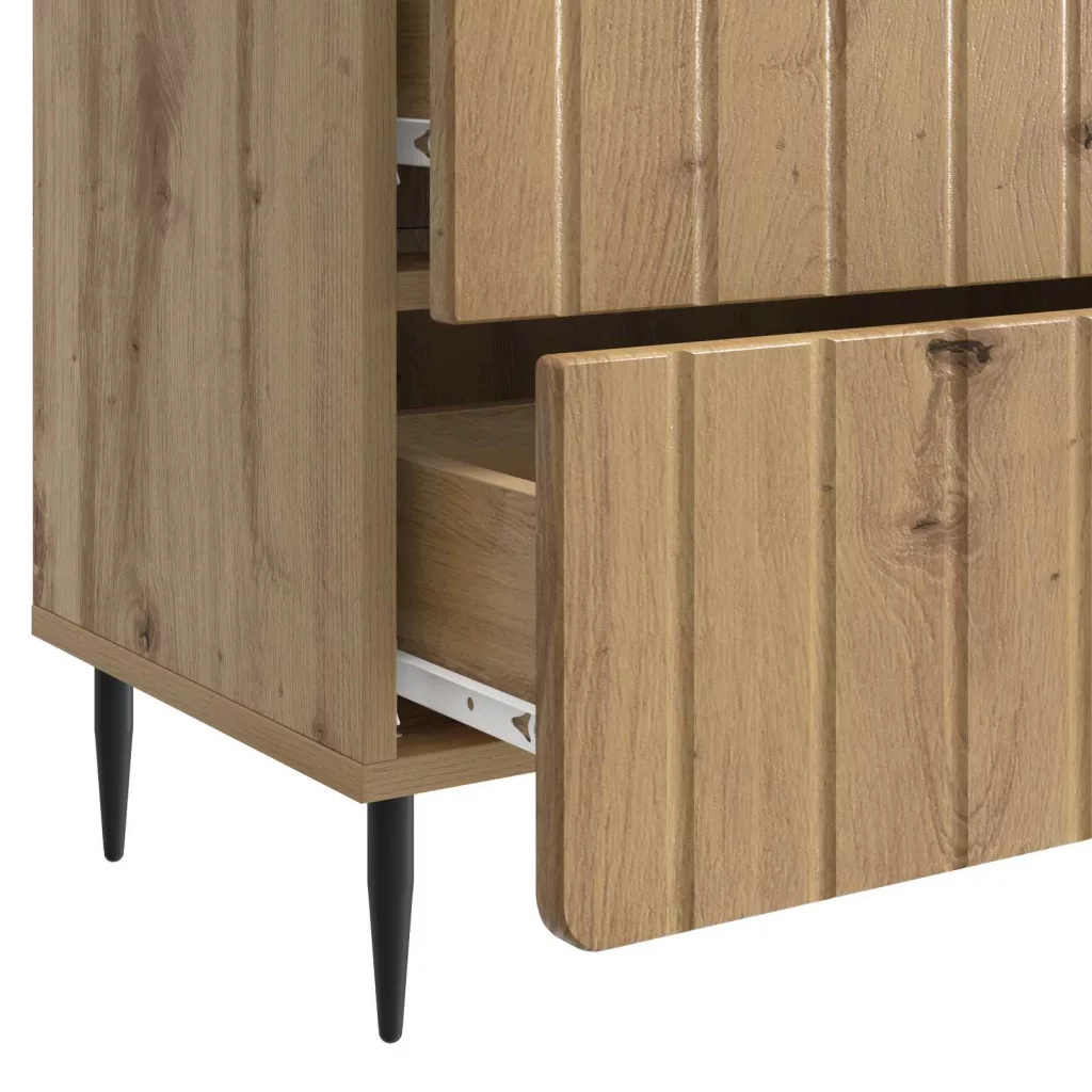 - Modern vas lábak: A fenntartott vas lábak segítik a stabilitást, elegáns megoldást adva a bútor alá. Az elegáns dizájn megkönnyíti a takarítást, így a szoba frissebbnek néz ki. Ez a modern vonalvezetés hangsúlyozza a szekrény praktikumát és esztétikáját.