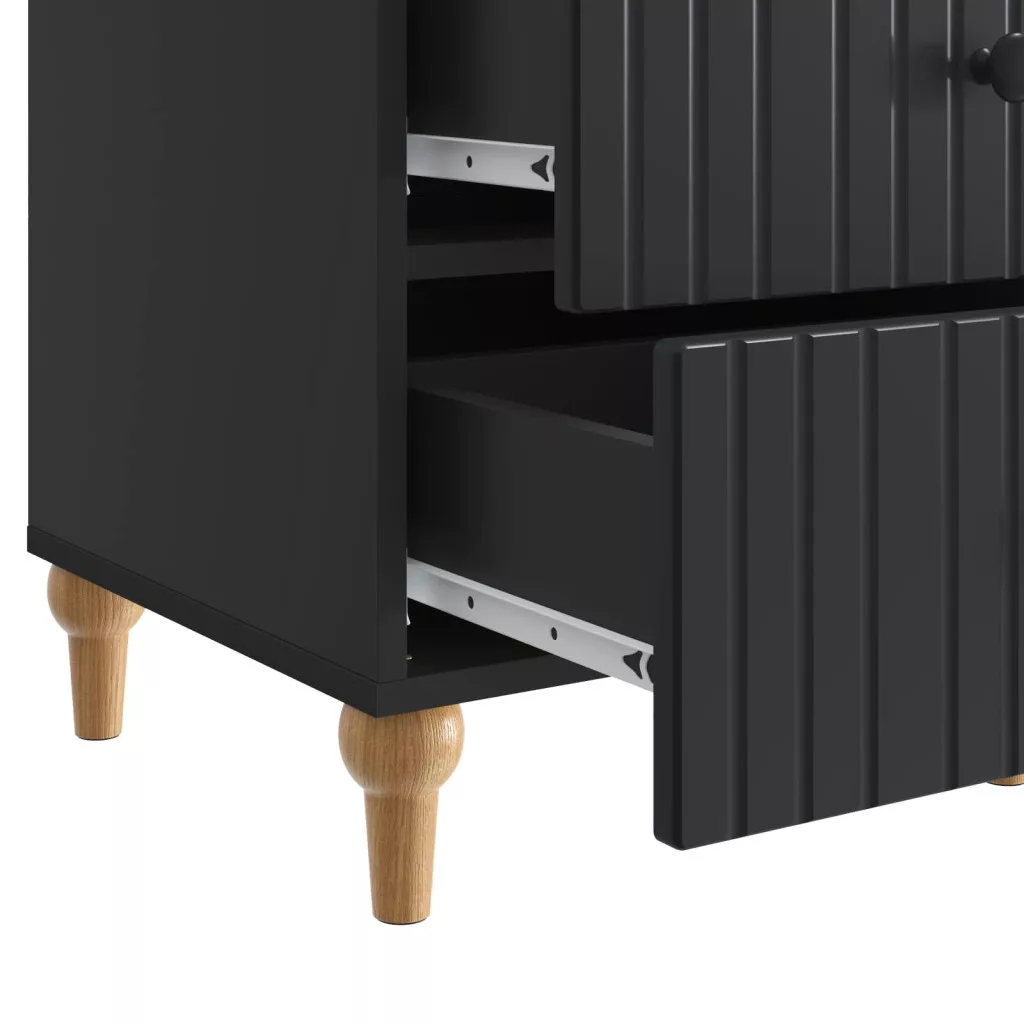 - Masszív fém fogantyúk: A fiókok stílusos fém fogantyúkkal vannak ellátva, kontrasztos fekete színben, ami tartós és vonzó. Ezek a fogantyúk biztos fogást adnak, megkönnyítve a fiókok nyitását. Merész megjelenésük igazán feldobja a szekrény összképét, növelve a modern érzést.