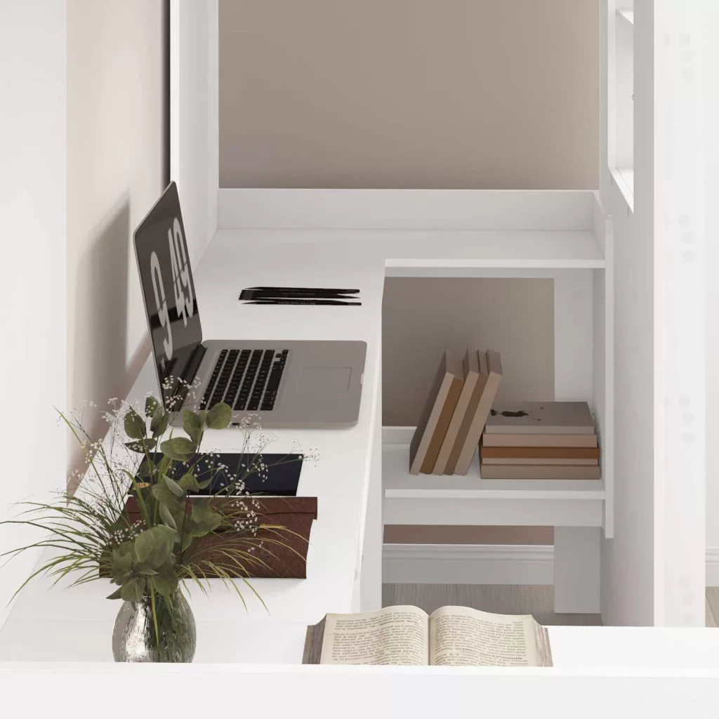 - Beépített alkatrészek: Van benne egy funkcionális íróasztal és néhány polc, amik helyet adnak a tanulásnak vagy munkának. Az íróasztal simán elférne egy laptop meg könyvek számára, míg a polcok extra helyet adnak a személyes tárgyaknak, így mindig rendben tarthatod a sarokban.