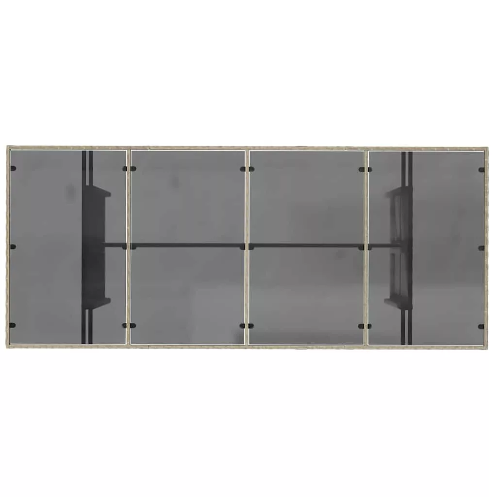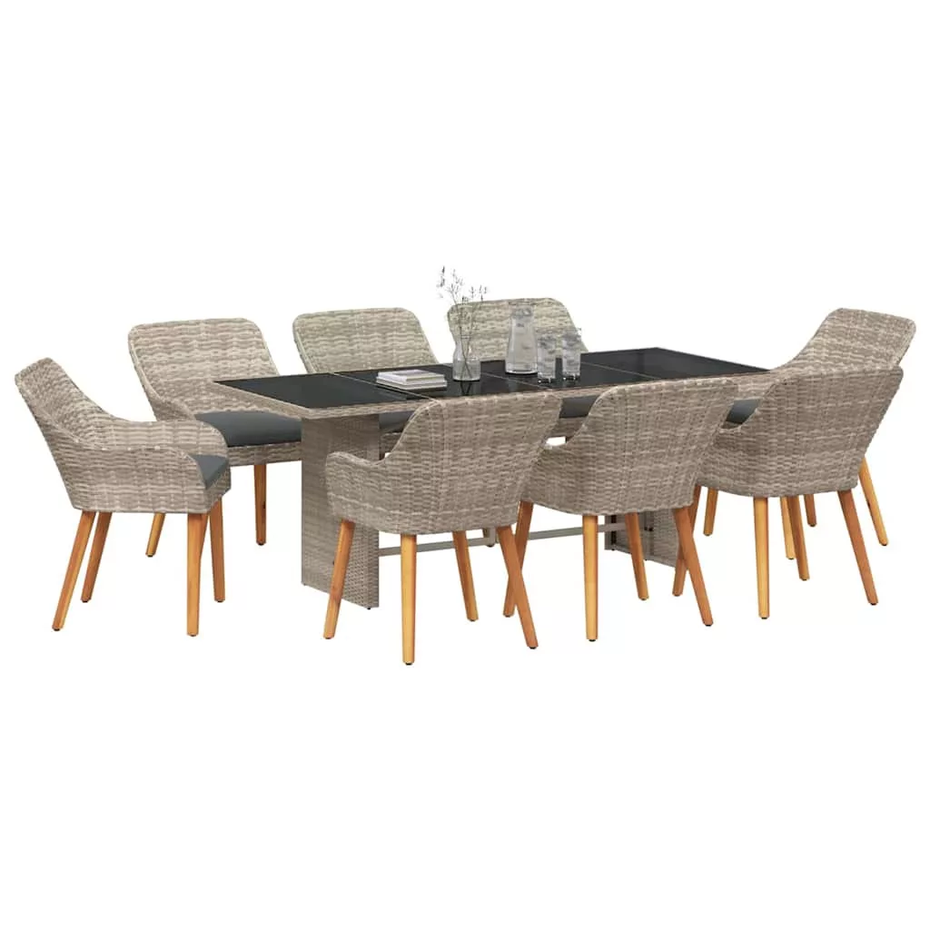 Ez a modern kerti étkezőszett kiemelkedik karcsú, téglalap alakú dizájnjával, remek választás kerti étkezésekhez. Világosszürke poli rattanból készült, így kortárs megjelenést hoz a kertedbe vagy a teraszodra, miközben megőrzi az örök eleganciát. Tiszta vonalainak és minimális díszítésének köszönhetően modern stílust képvisel, pihentető helyet kínálva az étkezésekhez a szeretteiddel. A háttámlák és robusztus üvegfelület praktikus funkciókat is ellátnak, ideális brunchok, vacsorák vagy kötetlen összejövetelek lebonyolítására.