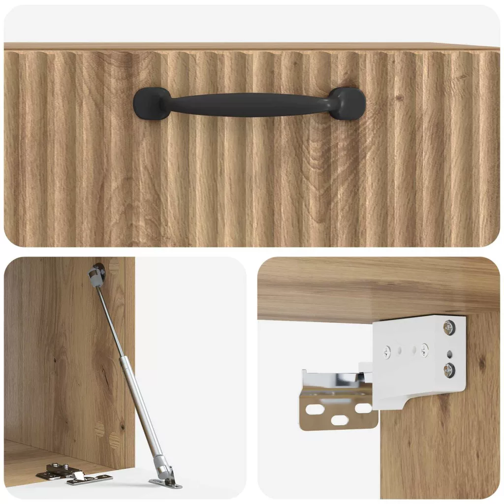 - Funkcionális 90°-os ajtók: A szekrény praktikus 90°-os lengőpántos ajtókkal van ellátva, amik könnyen hozzáférhetővé teszik a tárolt dolgokat. Az ajtók könnyen használhatók, miközben megőrzik a letisztult megjelenést.