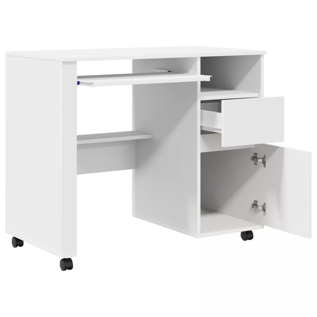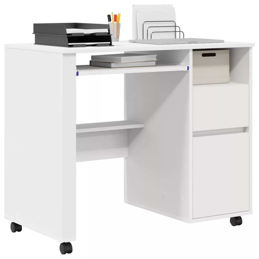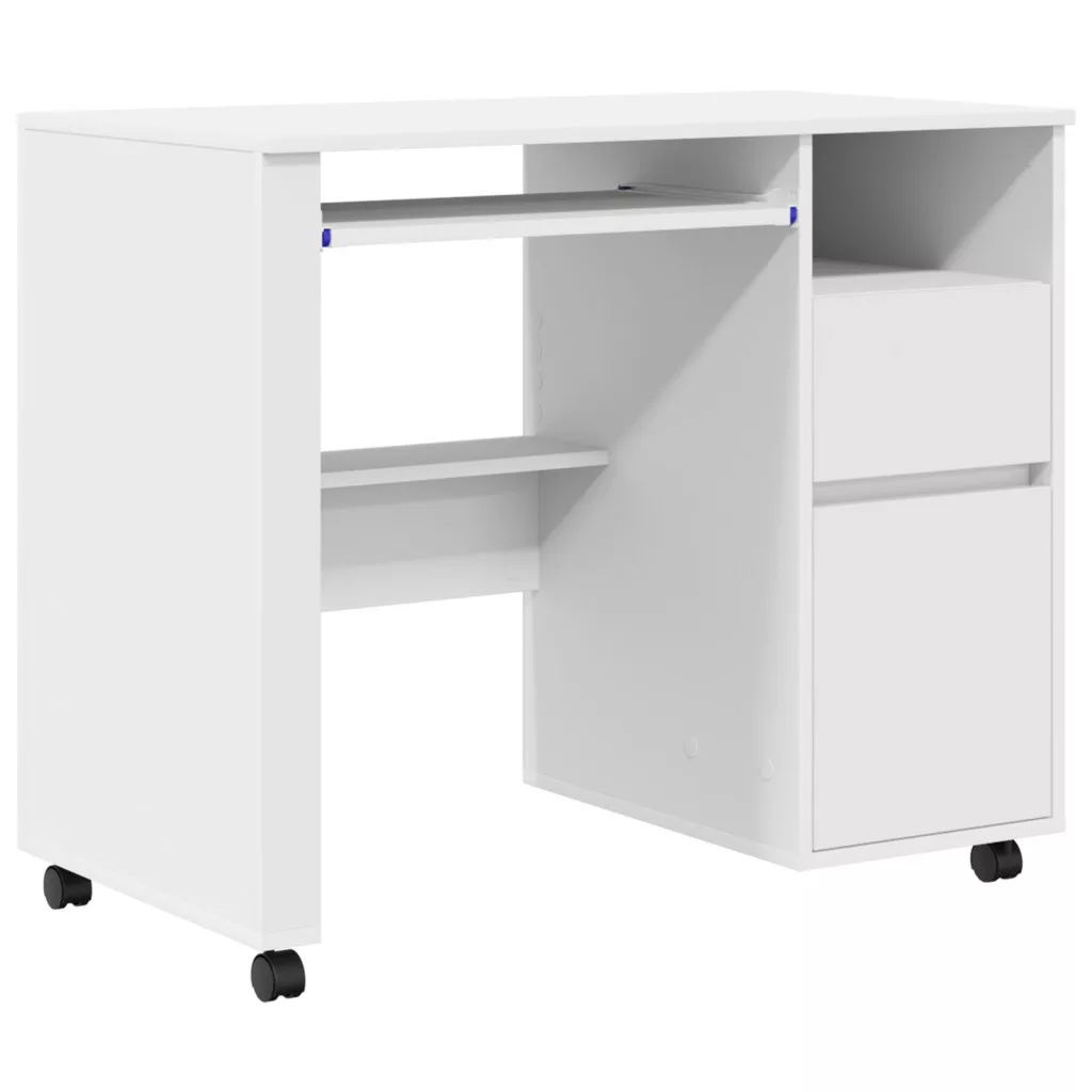 Ez a 'modern számítógépes asztal kerekeken'bármely modern otthoni iroda remek kiegészítője. A letisztult, modern dizájnja követi a trendeket, így stílusos és funkcionális munkateret kínál. Téglalap formája és texturált megjelenése könnyen passzol különböző szobastílusokhoz, mindkét hasznosságát és szépségét nyújtva. Az asztal számítógép használatra készült, és van benne hely a fontos munkakellékek rendszerezésére is.