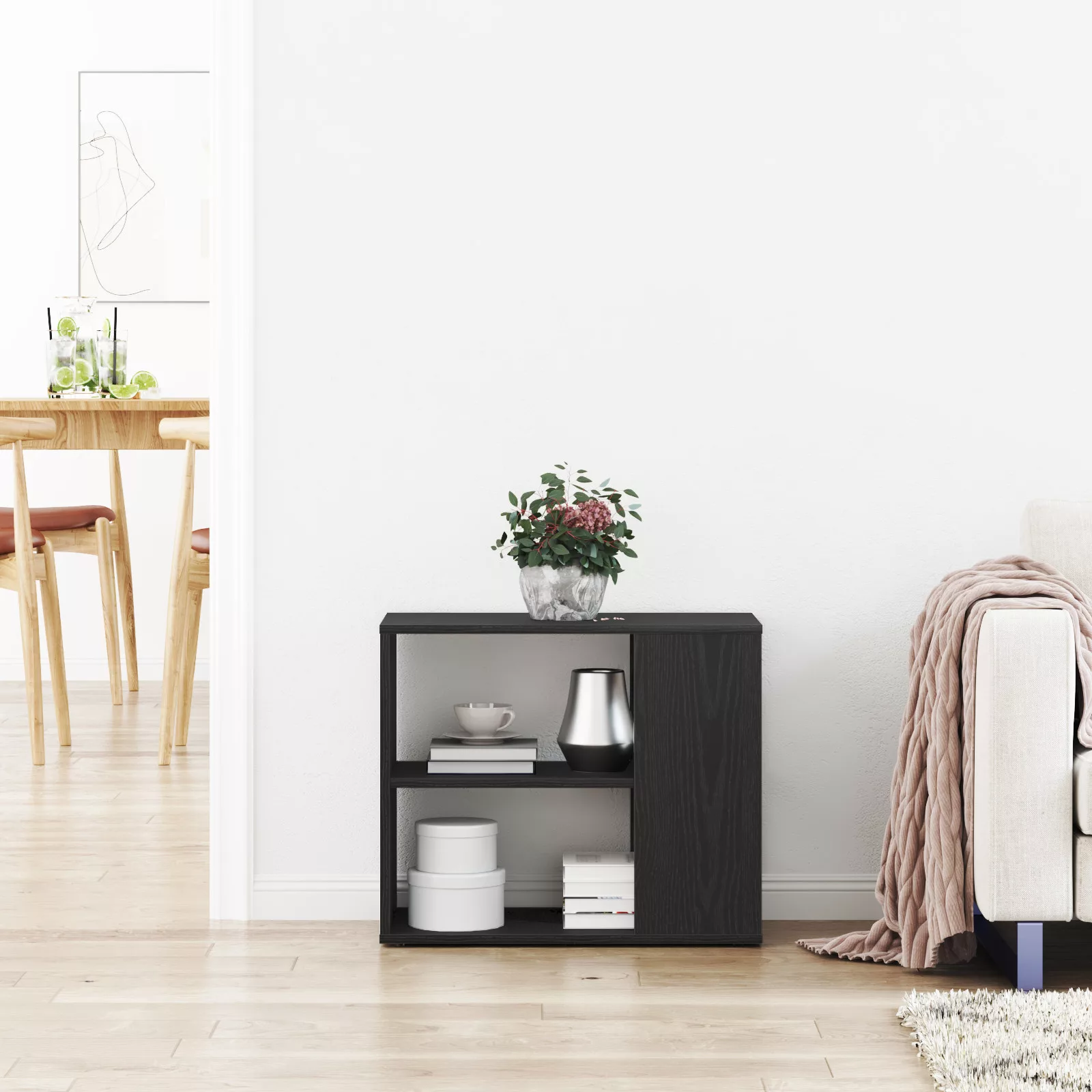 - Ajánlott használatok: Tökéletes a nappali dolgainak rendezésére, ez a tálalószekrény szinte bármilyen környezetbe illik. Térkímélő kialakítása miatt keskeny helyekhez is ideális, míg modern megjelenése simán illeszkedik kortárs belső terekhez.