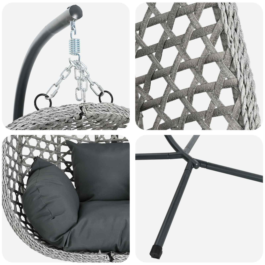 Ez a függő tojás szék, állvánnyal egy igazán menő darab, ami feldobja a panaszos helyeket. Kiválóan illik azoknak, akik a magányra vágynak, mert modern stílusa minden környezetbe passzol. Tökéletes választás nappalikba, erkélyekre, kertekbe vagy teraszokra, egy nyugodt helyet kínál a hétköznapok zűrzavara ellen. Az elliptikus formája megkönnyíti a pihenést, míg a masszív polirattan konstrukció minden helyzetben stabil és kényelmes ülési élményt biztosít. Puhább párnázattal az ideális hely, hogy lazíts egy fárasztó nap után.
