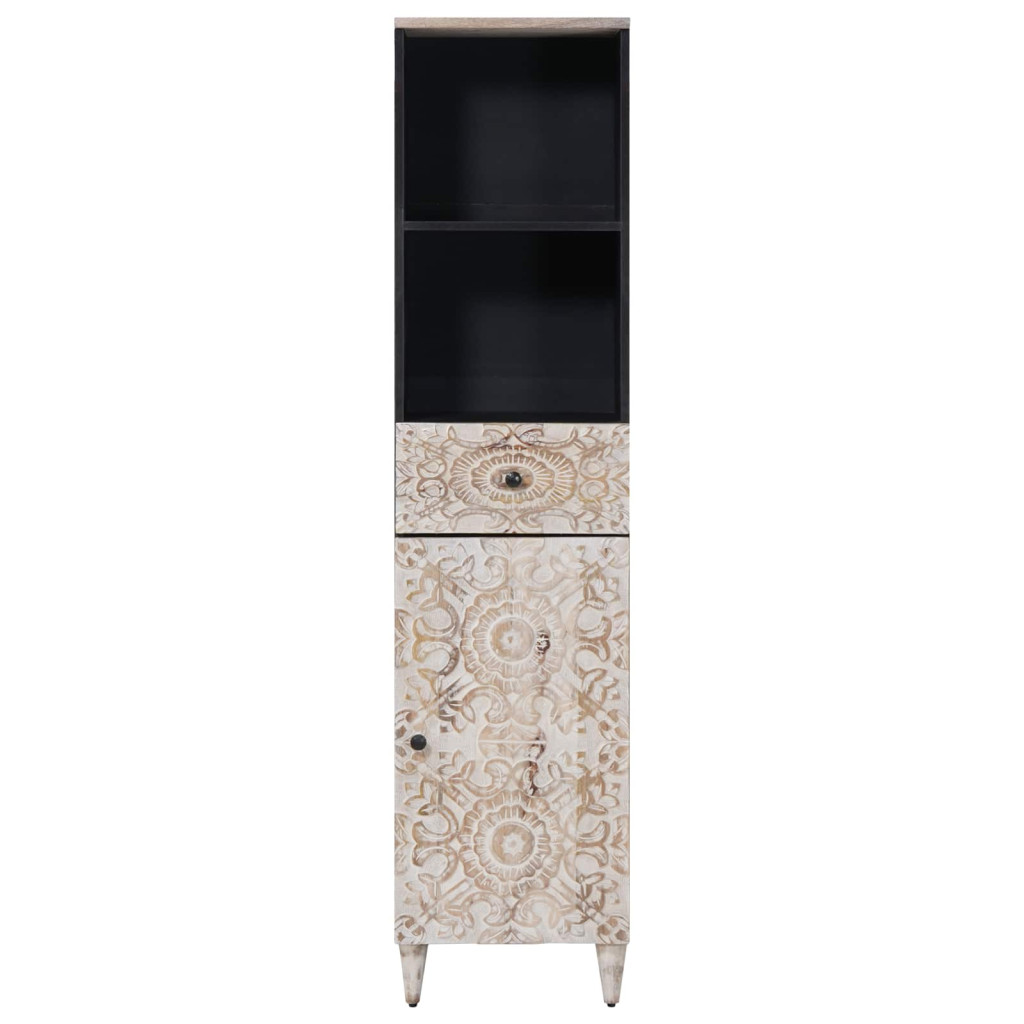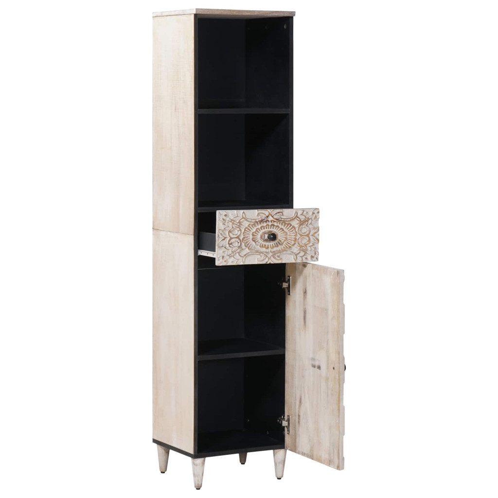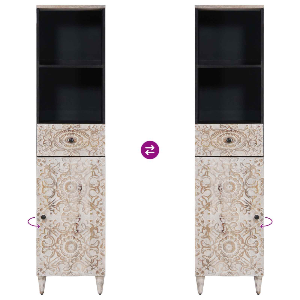 - Tömör mangófa: Ez a szekrény különleges tömör mangófából készült, ami gazdag textúrát és vonzó mintázatot ad neki, erősítve a modern dizájnját. A masszív fa biztosítja, hogy hosszú ideig kitartson, megbízható tárolást kínálva. Természetes nedvesség-ellenállása miatt ideális fürdőszobai használatra.