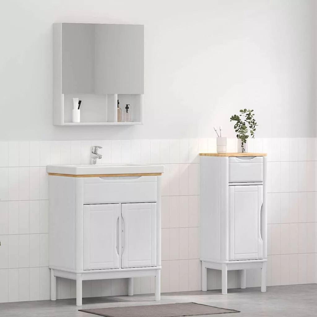 Ez a Modern Fürdőszobabútor Szett stílusos és letisztult megjelenést ad bármilyen fürdőszobának. Mindennapi használatra tervezve, a szett a stílus és praktikusság tökéletes kombinációját nyújtja, ami egy nyugodtabb, rendezettebb környezetet teremt. A klasszikus, négyszögletes forma és modern dizájn simán passzol a kortárs dekorhoz, míg a tömör fenyőfa tartósságot garantál. Tökéletes választás annak, aki a minimalista elegancia szereti, különböző ízlésű és konfigurációjú fürdőszobákban. Ez a szett a tiszta stílust hirdeti. Gondosan megtervezve, ez a bútorszett egy nyugodt, harmonikus szentélyt idéz elő, amit minden nap élvezhetsz.