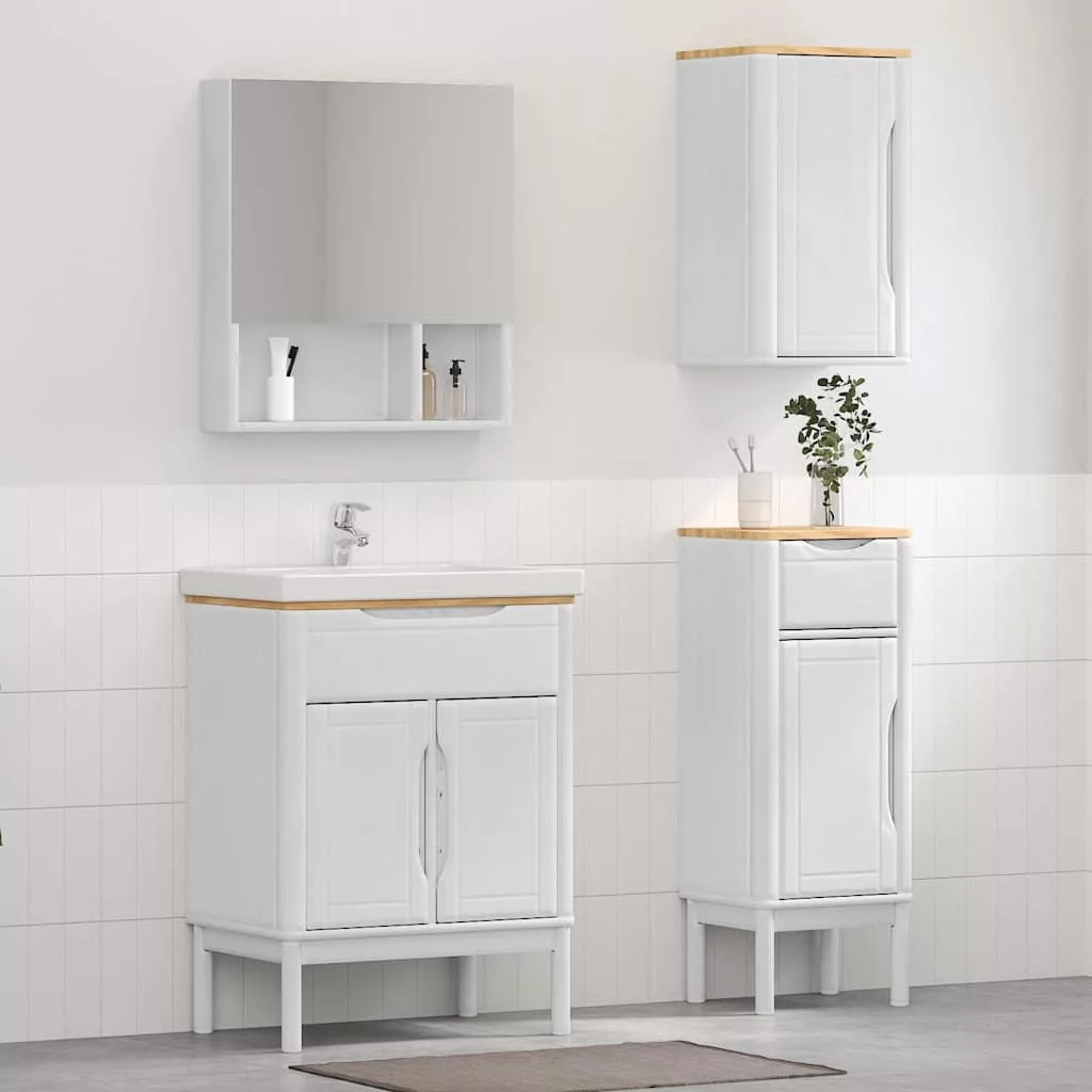 Ez a Modern Fürdőszobabútor Szett stílusos és letisztult megjelenést ad bármilyen fürdőszobának. Mindennapi használatra tervezve, a szett a stílus és praktikusság tökéletes kombinációját nyújtja, ami egy nyugodtabb, rendezettebb környezetet teremt. A klasszikus, négyszögletes forma és modern dizájn simán passzol a kortárs dekorhoz, míg a tömör fenyőfa tartósságot garantál. Tökéletes választás annak, aki a minimalista elegancia szereti, különböző ízlésű és konfigurációjú fürdőszobákban. Ez a szett a tiszta stílust hirdeti. Gondosan megtervezve, ez a bútorszett egy nyugodt, harmonikus szentélyt idéz elő, amit minden nap élvezhetsz.