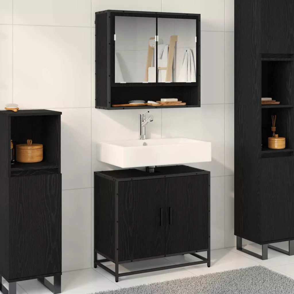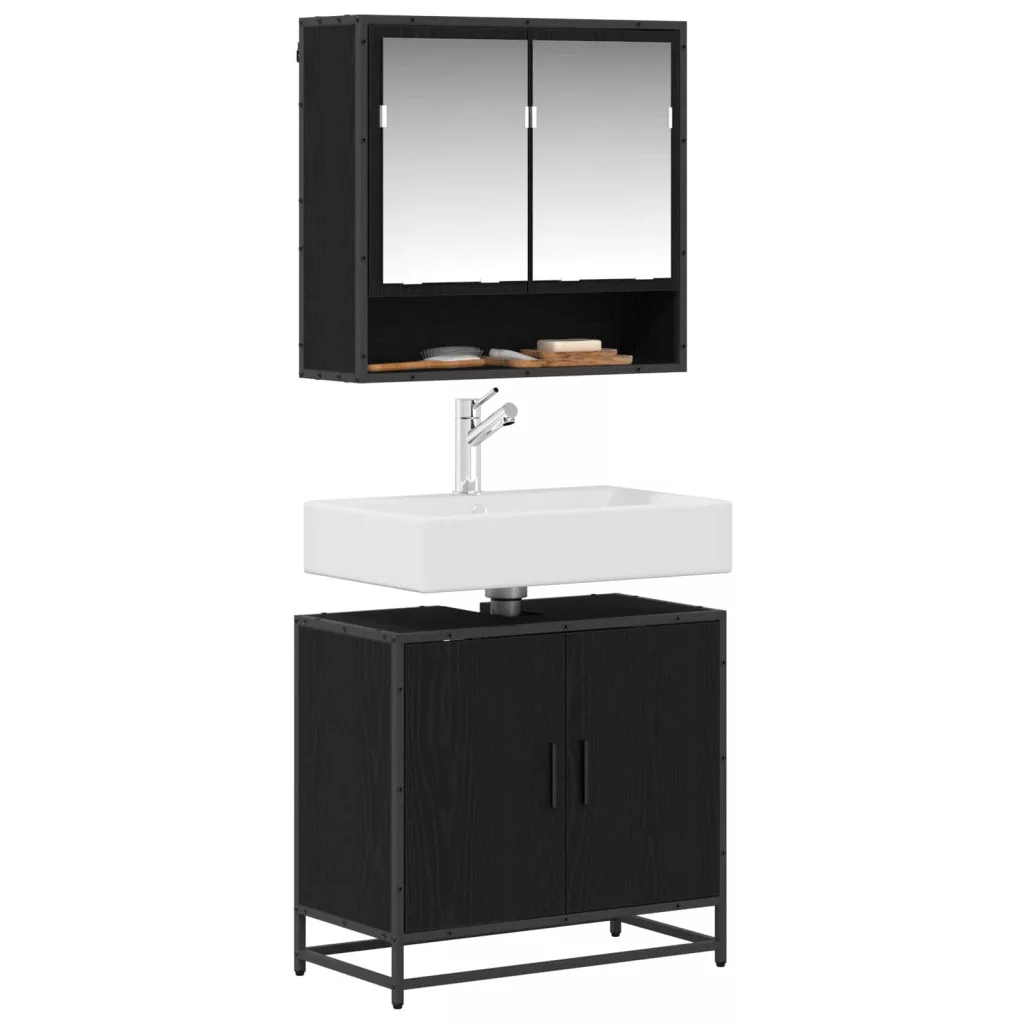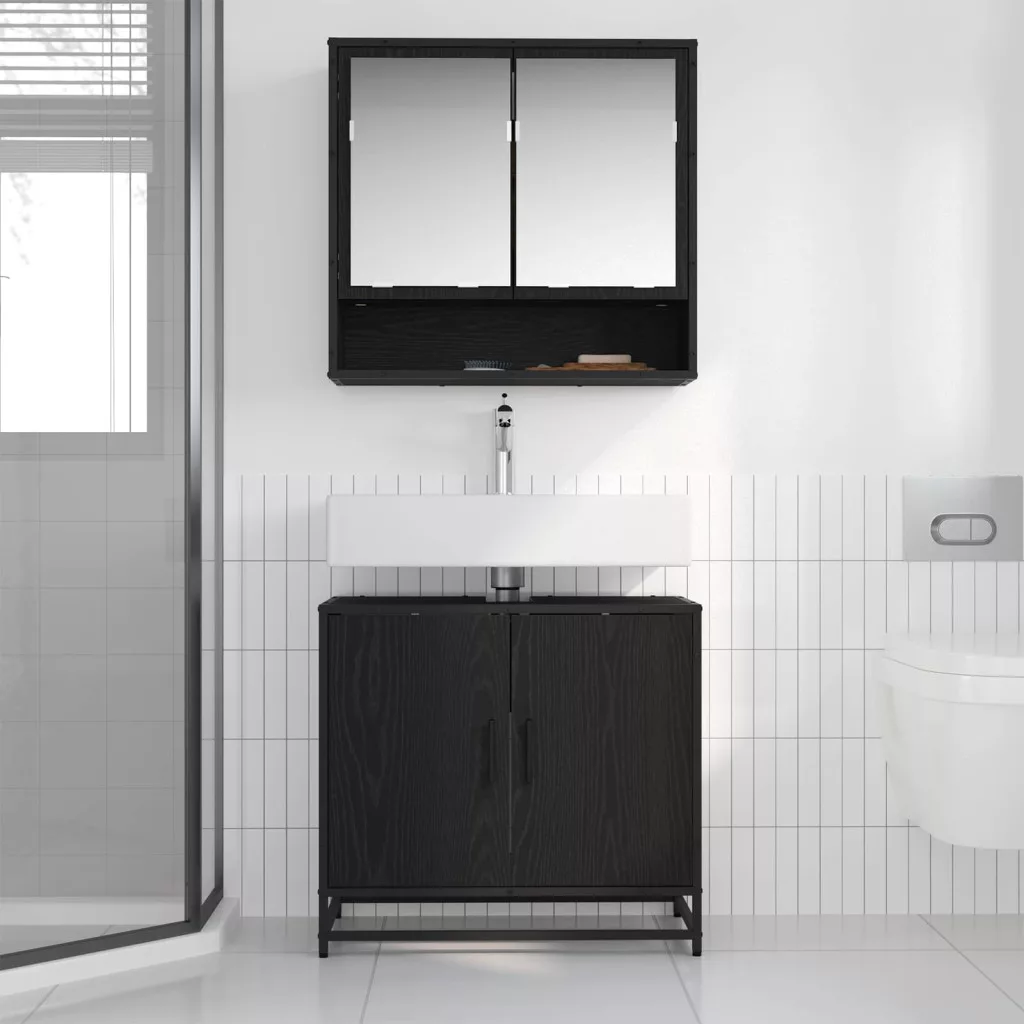 - Belső komponensek: A szett egy falra szerelhető tükörszekrényt és egy mosdószekrényt tartalmaz. A tükörszekrény segít sminkelni, míg a mosdószekrény sok tárolóhelyet ad, így minden napi szükséges dolgot rendben tudsz tartani. Az süllyesztett ajtó és a fekete fogantyúk modern megjelenést biztosítanak, fokozva a funkcionalitást és az eleganciát.