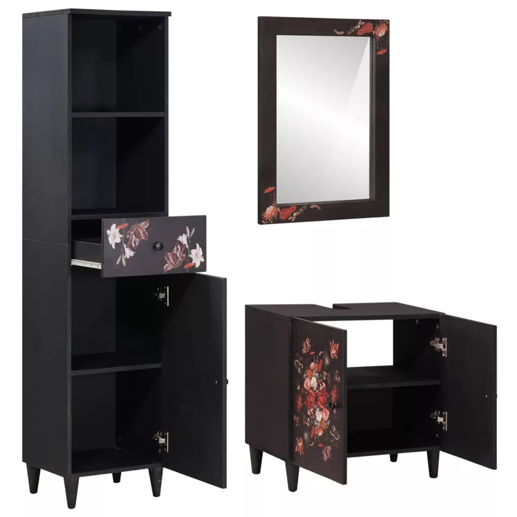 - Jellemzők/Funkció/Design: A szett csodás virágmintákkal díszített, ami igazán természetes és esztétikus érintést ad a fürdőszobának. A sárgaréz gombok pedig elegáns kontrasztot alkotnak a barna fafaragással, így időtlen vonzalmat biztosítanak minden modern fürdőszobának.