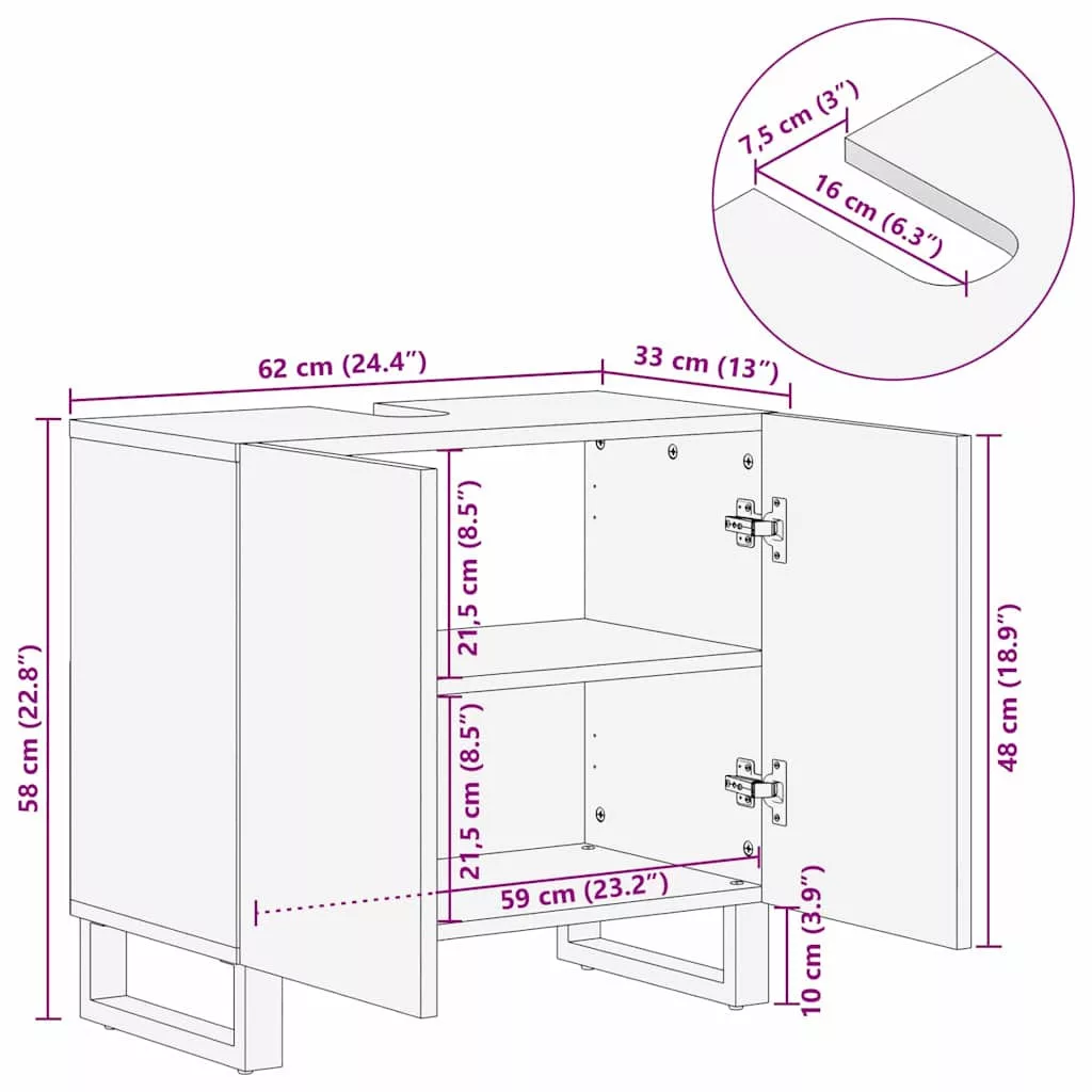 - Anyag: Tömör mangófából készült, ezzel a szekrény a természet egy darabját hozza el. A masszív fa biztosítja a tartósságát és az ellenállását a napi használat során. A texturált felülete kiemeli a fa természetes szépségét, meleg és hívogató légkört teremtve a fürdőszobában. Ezzel az anyaggal esztétikailag vonzó és öko-tudatos hangulatot teremthetsz a belső térben.