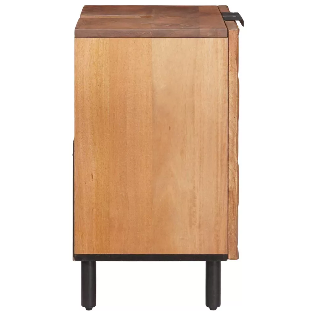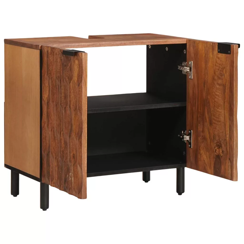 Ez a modern fürdőszobai mosdókagyló szekrény tökéletes egyensúlyban van a funkcionalitás és a stílus között. Tömör mangó fából készült, és méretei 62 x 33 x 58 cm, így bármilyen fürdőszobába jól illik, ha szereted az eleganciát. A téglalap alakú dizájn segít, hogy szorosabban illeszkedjen a falhoz, harmonikus szellősséget teremtve. A különféle fürdőszobai dolgok tárolására készült, praktikus és jól szervezhető megoldást biztosít.