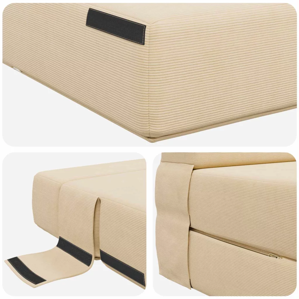 - Biztonságos és stabil beállítás: A kanapéágy tépd-záras rögzítőket tartalmaz, amelyek megakadályozzák, hogy elmozduljon, így biztosítva a stabilitást akár kanapéként, akár ágyként használod. Ezek a zárások egyszerűsítenek a használaton, csökkentve az aggodalmakat a helyzetbeállítással kapcsolatban.