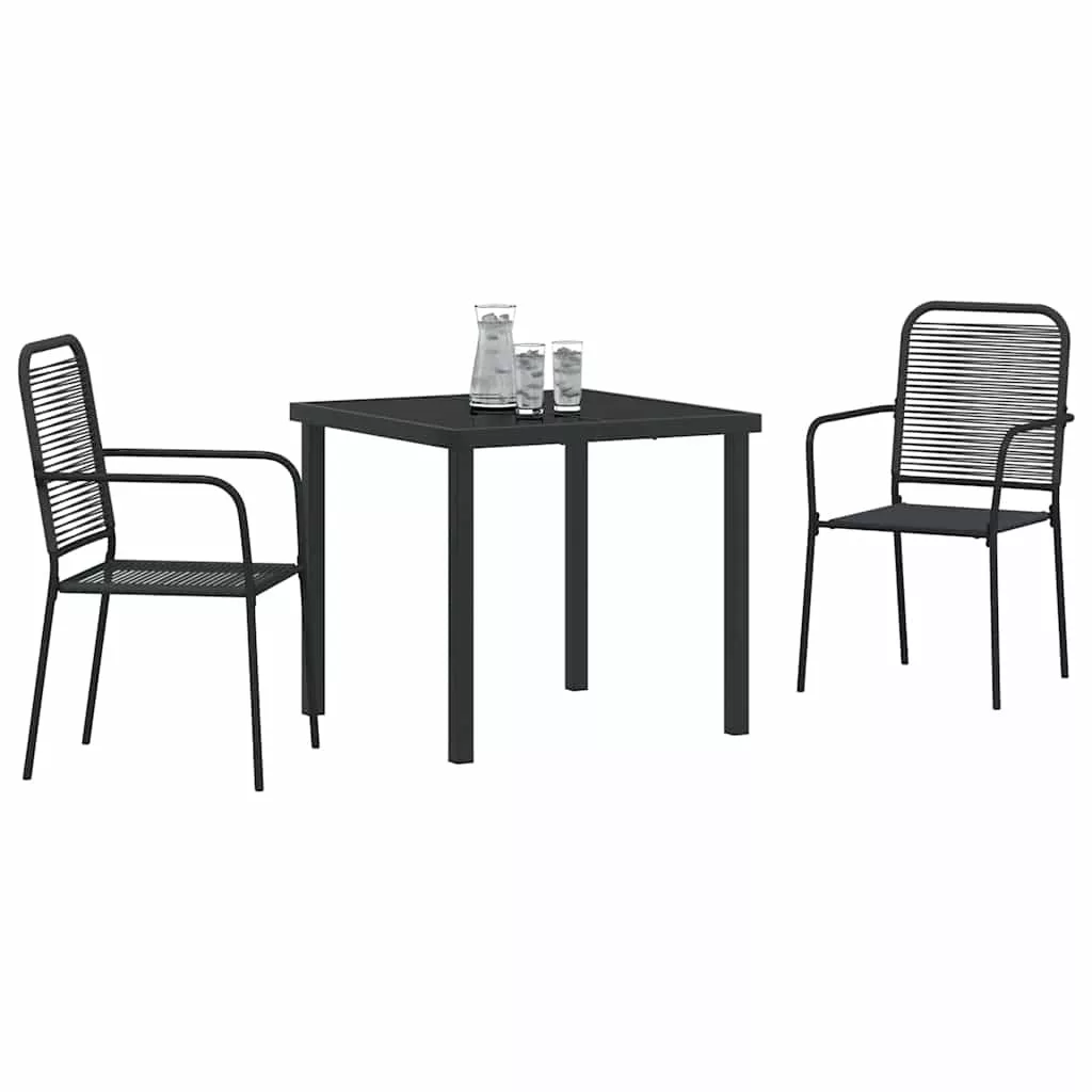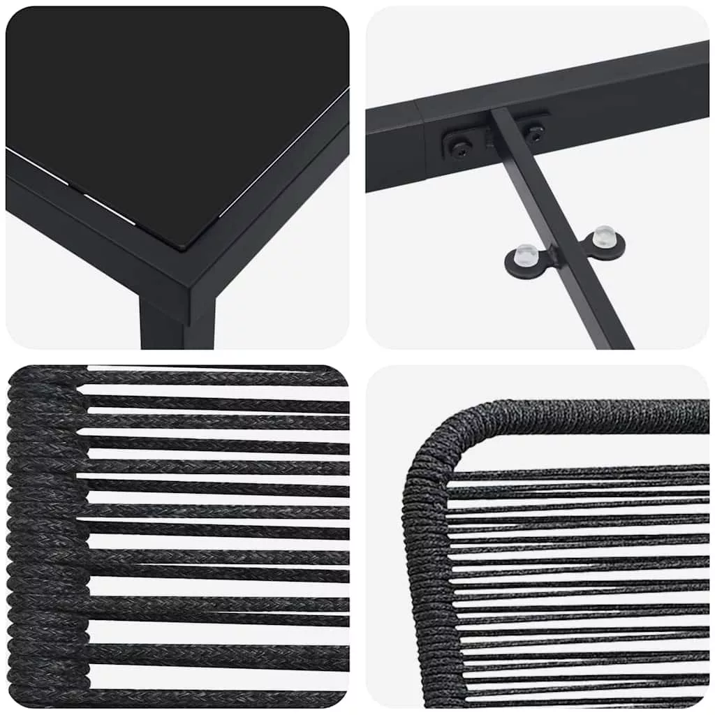 Ez a kortárs kert étkezőszett a stílus és a praktikum tökéletes kombinációja bármely kültéri helységbe. A modern dizájnnal készült, elegáns, téglalap alakú asztala ideális a kert és a terasz használatára. A merész fekete szín eleganciát visz kültéri dekorációdba, míg a porfestett acélváz biztosítja a hosszú élettartamot. Ez a szett remek helyet ad összejövetelekhez vagy nyugodt szabadtéri étkezésekhez, így a kerted kellemes és barátságos hellyé válik családod és barátaid számára.