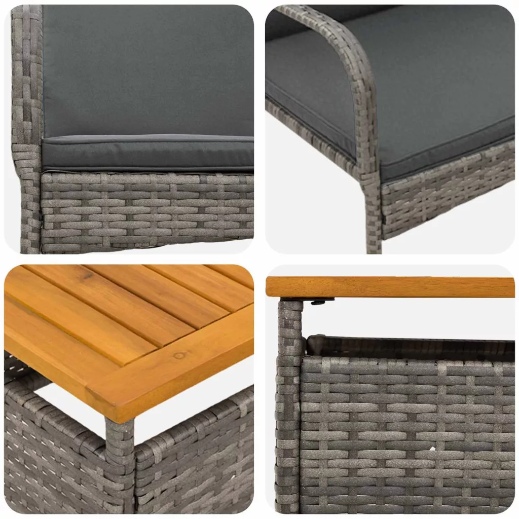 • Időjárásálló: Ez a kerti szett porszórt acélból és polirattanból készült, ami remek védelmet nyújt a környezeti hatások ellen. UV- és időjárásálló, így néhány év múlva is tartós marad.