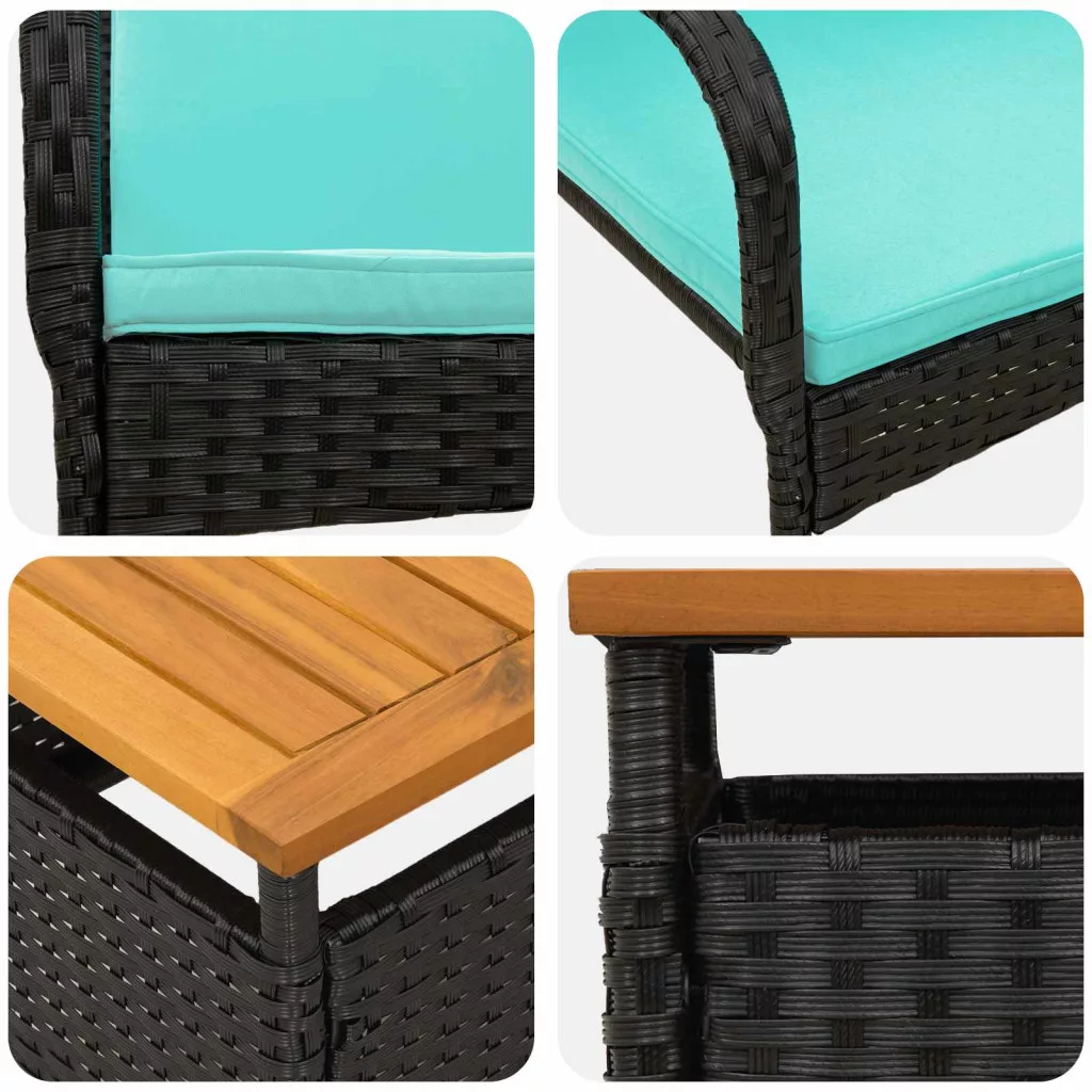 • Akácfa asztallap: Az asztal akácfa asztallapja természetes olajjal van kezelve, ami stabil felületet biztosít italoknak és harapnivalóknak. Ezt a tartósság miatt választották, és illik a különböző kültéri környezetekhez.