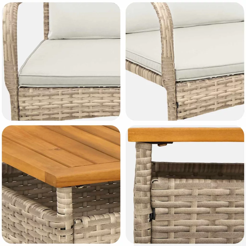 • Időjárásálló: Ez a kerti szett porszórt acélból és polirattanból készült, ami remek védelmet nyújt a környezeti hatások ellen. UV- és időjárásálló, így néhány év múlva is tartós marad.