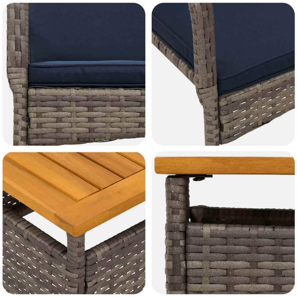 • Akácfa asztallap: Az asztal akácfa asztallapja természetes olajjal van kezelve, ami stabil felületet biztosít italoknak és harapnivalóknak. Ezt a tartósság miatt választották, és illik a különböző kültéri környezetekhez.