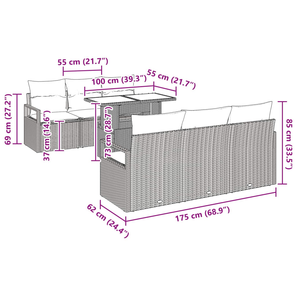 - Prémium anyagok: Magas minőségű polirattan, UV-védelemmel és nedvességállósággal, így alapdarab a kültéri térben. A poliészter párnák garantálják a kényelmet, miközben feldobják az összképet.