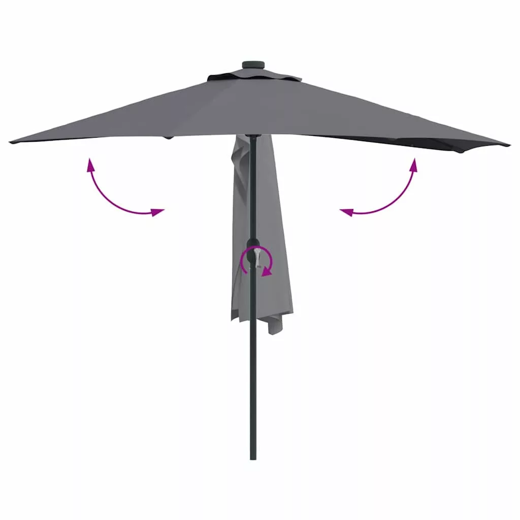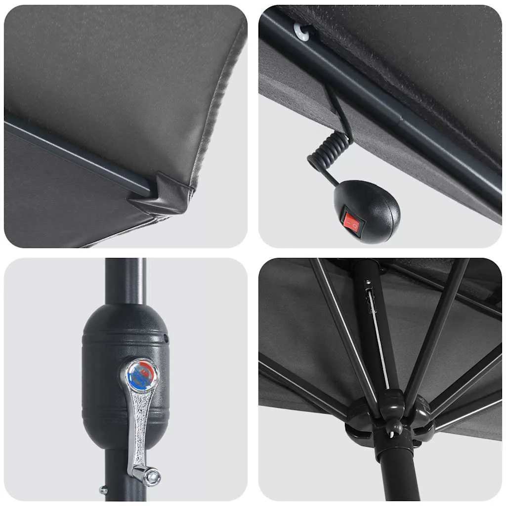 - LED Világítás: Integrált LED fények világítják meg a napernyő alját, így az estéket varázslatosabbá teszi. Ezek a dekoratív lámpák fokozzák az esti élményeket, lehetővé téve a külső programokat még sötétedés után is. Energiamanagelt napenergiával működnek.