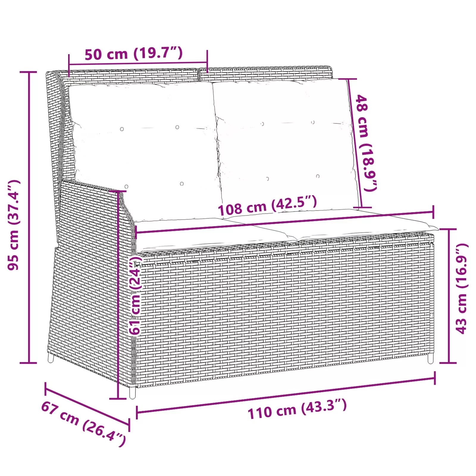- 1 x Fekvő kerti pad: 110 x 67 x 95 cm (WxDxH)