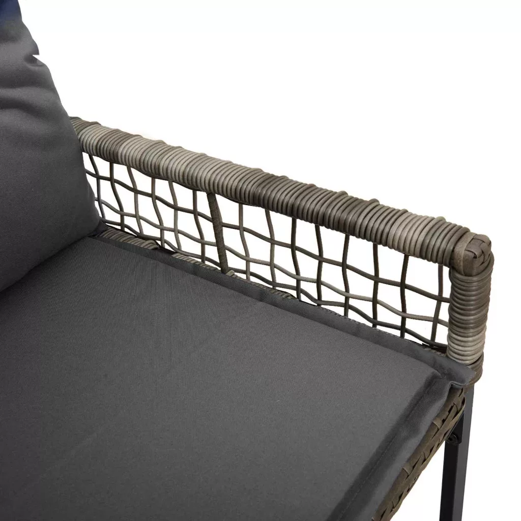 - Anyagok: Kiváló minőségű PE rattan és szövet; tökéletes mix a tartósság és a kényelem között a modern, de mégis természetes hatásért. A PE rattan erős és időjárásálló, így egy jóval hosszabb ideig bírja a sarat.
