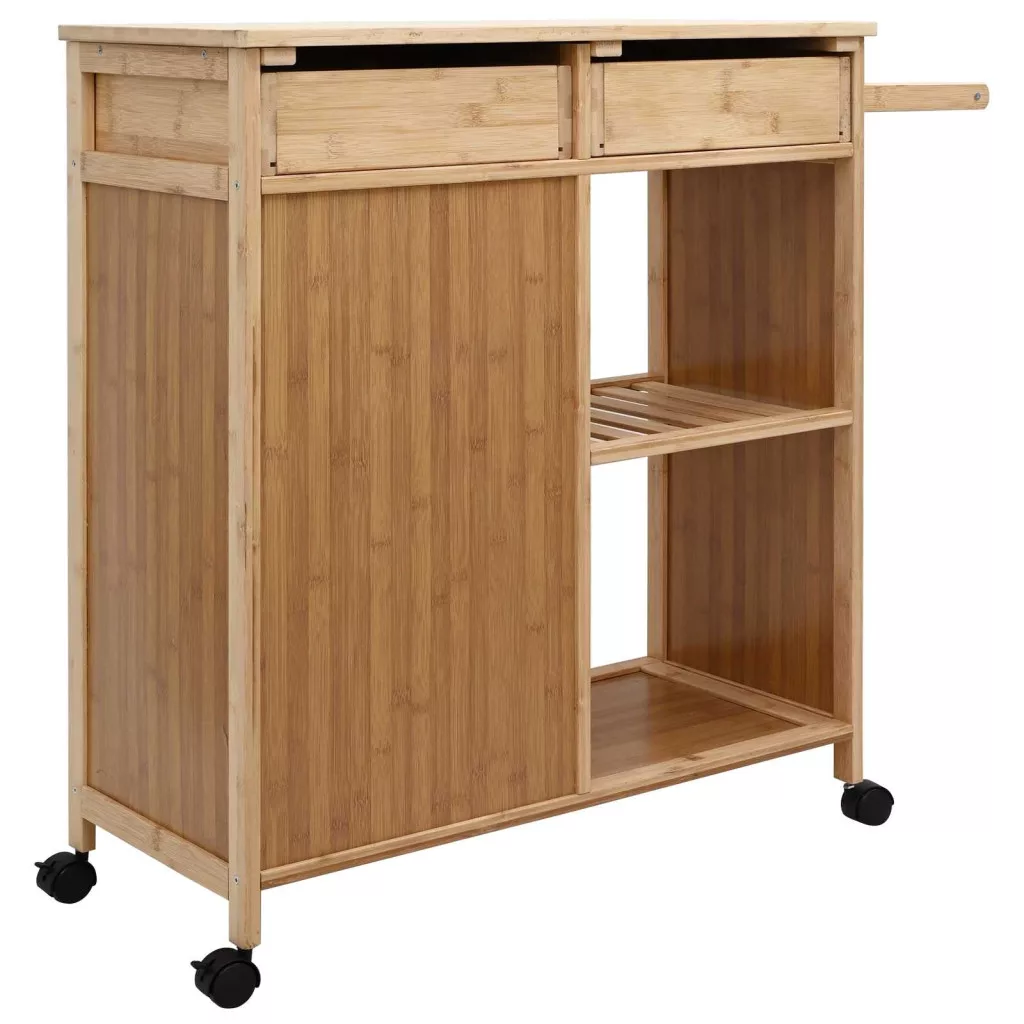 Ez a modern konyhai kocsi kerekekkel nagyon sokoldalú, tökéletes bármilyen konyhához vagy étkezőhez. A funkcionalitást stílussal ötvözi, a természetes bambusz színe pedig minimalista megjelenést ad, jól kiegészítve a kortárs otthoni dekorációt. Téglalap alakú, sima beltéri használatra készült, szuper a konyhai alapanyagok rendezésére és egy extra munkafelület biztosítására főzés közben.