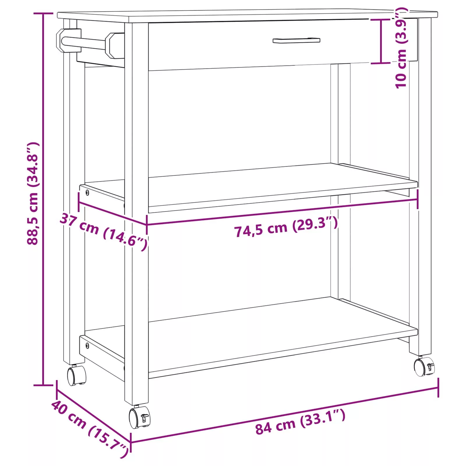 - Sokoldalú tárolási lehetőségek: A kocsink bőséges polcot és fiókot kínál, szóval minden tárolási igényt kielégít, akár eszközökről, akár bár kellékekről van szó. A fiók diszkrét tárolást biztosít, míg az nyitott polcok remekül mutathatják a dekorációt vagy a gyakran használt eszközöket. Ez a kombináció segít a konyha rendben tartásában.