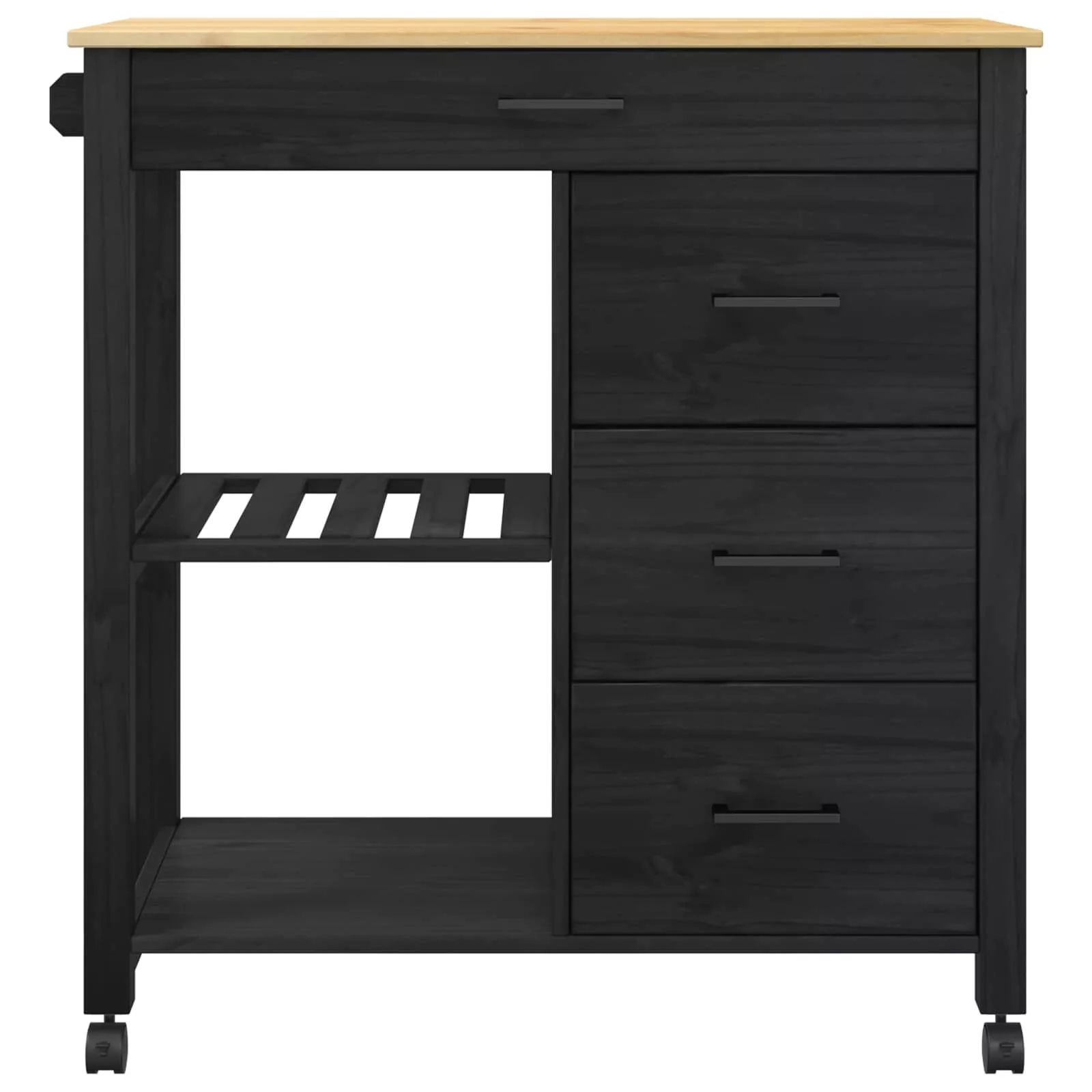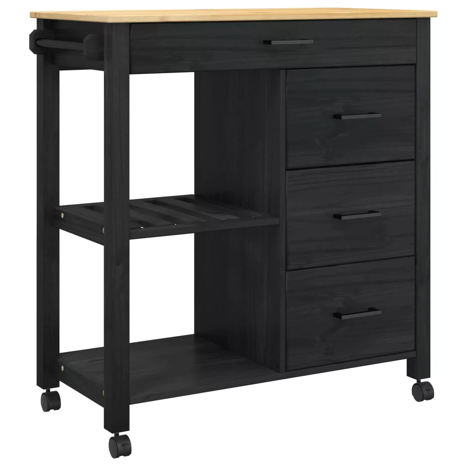- Anyagok: Tömör fenyőfából készült, ez a konyhai kocsi tartós és szép. A fa textúrája és színei klasszikus hatást adnak, miközben hosszú élettartamot biztosítanak.