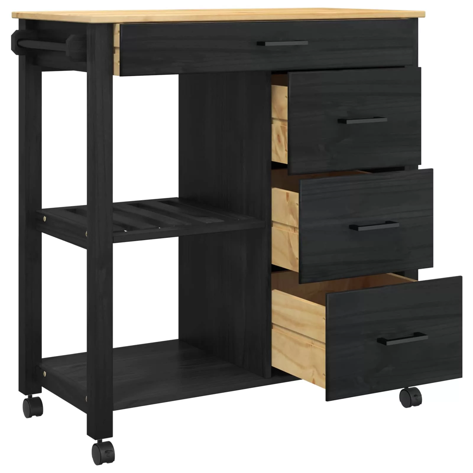 - Beszállított alkatrészek: A kocsi tágas fiókokkal és polccal felszerelt, így könnyebb rendszerezni a konyhai alapanyagokat. Négy 360°-ban forgó kerékkel jön, melyek közül kettő zárható, így stabil marad.