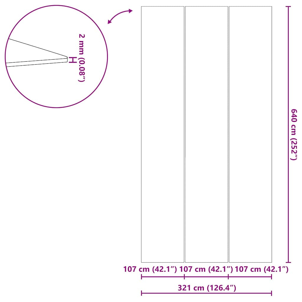 - Általános dimenziók: 640 x 321 x 0,1 cm (Ho x Szé x Ma)