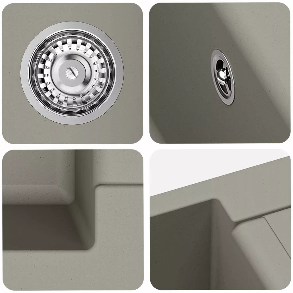- Anyagok: Készül egy speciális keverékből, 80% kvarcból és 20% gyantából, ami extra tartósságot biztosít. Ez az összetétel remek ellenállást nyújt a karcoknak, így a mosogató megőrzi a hibátlan kinézetét még intenzív használat során is.