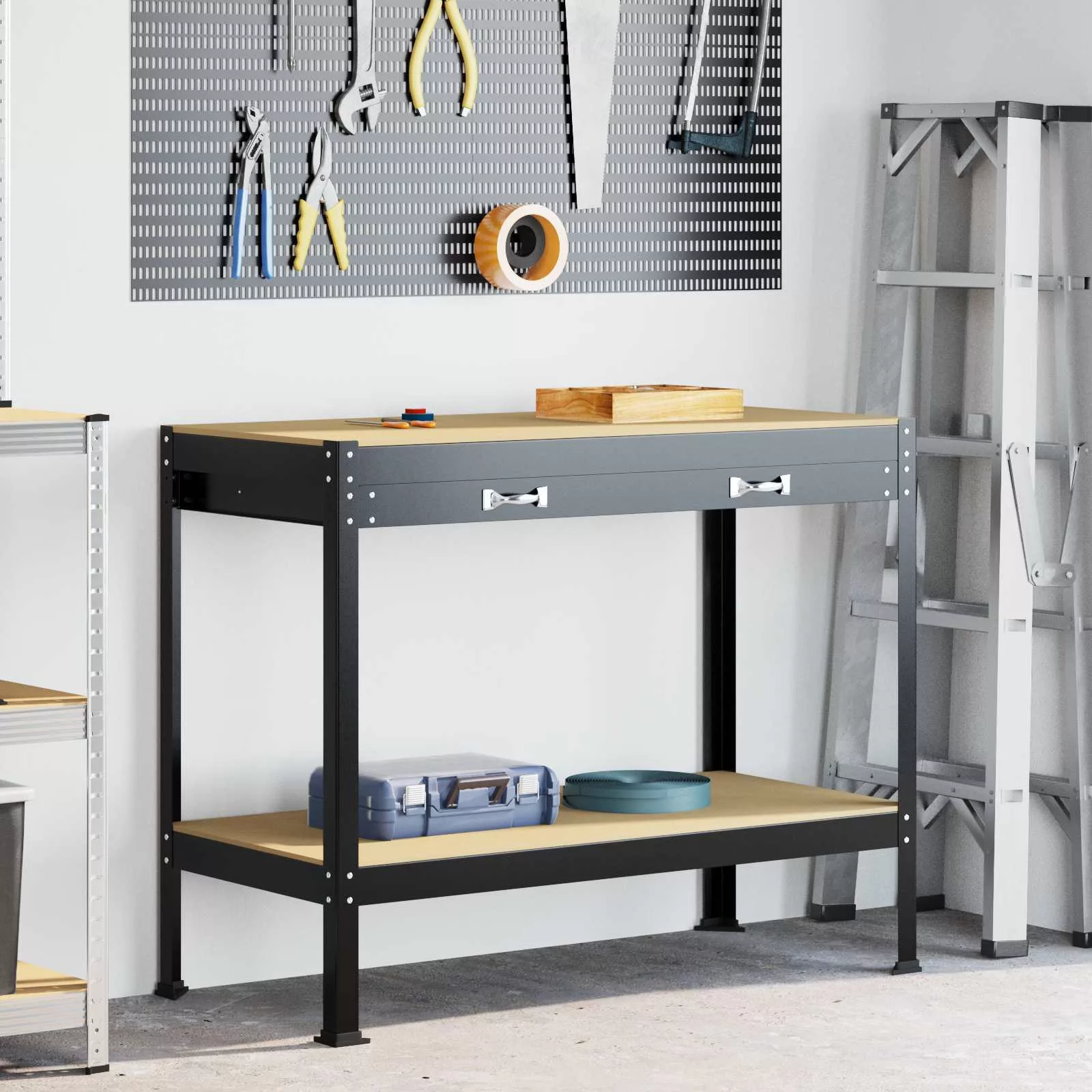 Ez a modern munkaasztal a sokoldalúság és hatékonyság jegyében készült, jól passzol a garázsokhoz és műhelyekhez. Mérnöki fából és fémből készült, robosztus, stabil munkafelületet ad a különböző feladatokhoz, miközben praktikus tárolók segítik a rendet tartani. A kampós háttámla és beépített fiók miatt a szerszámok és kiegészítők mindig kéznél vannak.