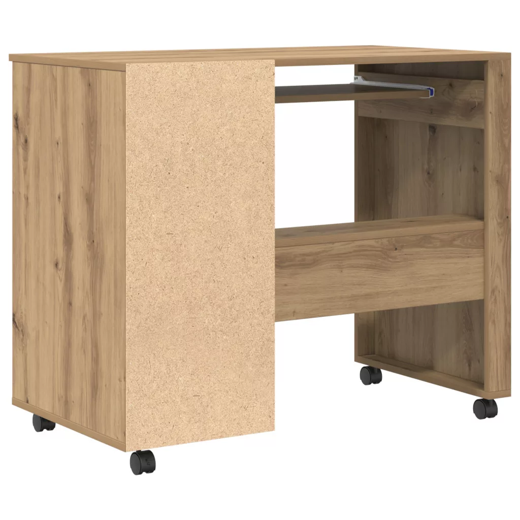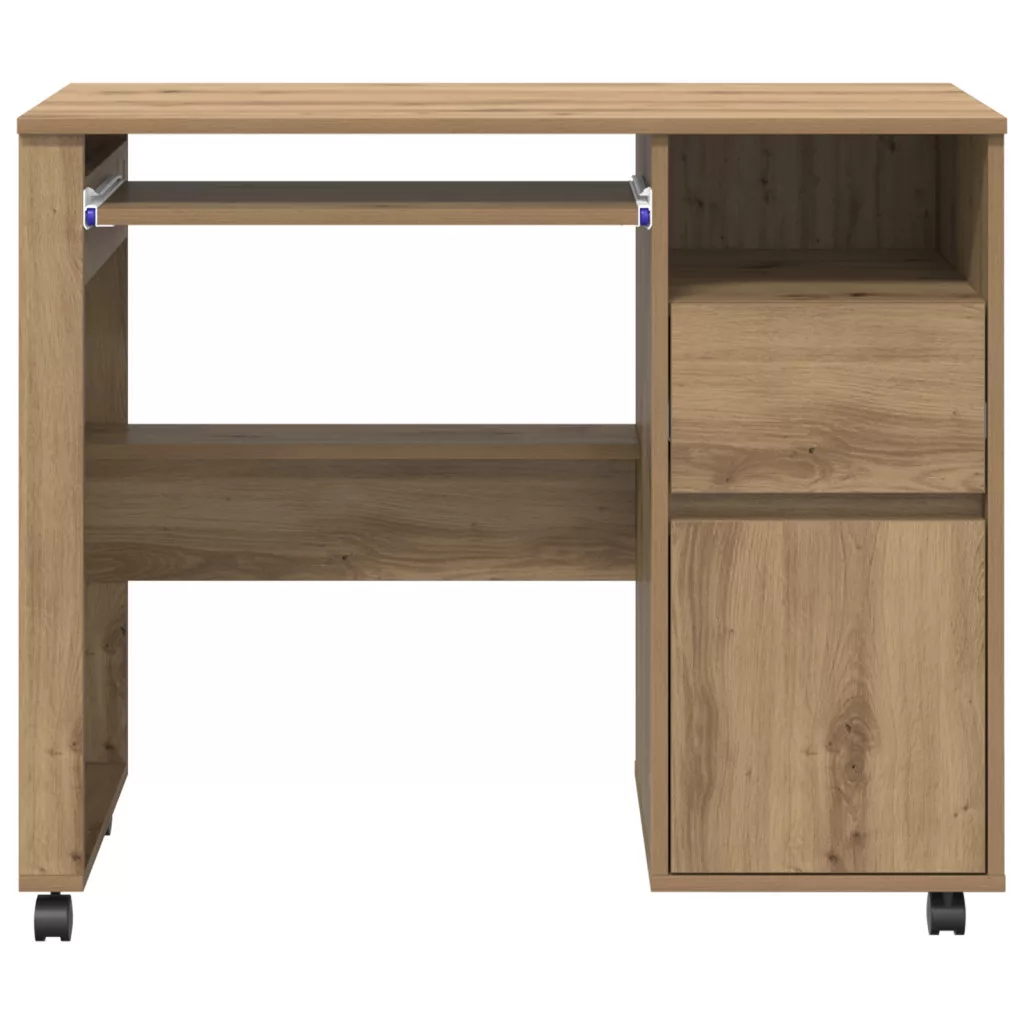 Ez a 'modern számítógépes asztal kerekeken'bármely modern otthoni iroda remek kiegészítője. A letisztult, modern dizájnja követi a trendeket, így stílusos és funkcionális munkateret kínál. Téglalap formája és texturált megjelenése könnyen passzol különböző szobastílusokhoz, mindkét hasznosságát és szépségét nyújtva. Az asztal számítógép használatra készült, és van benne hely a fontos munkakellékek rendszerezésére is.