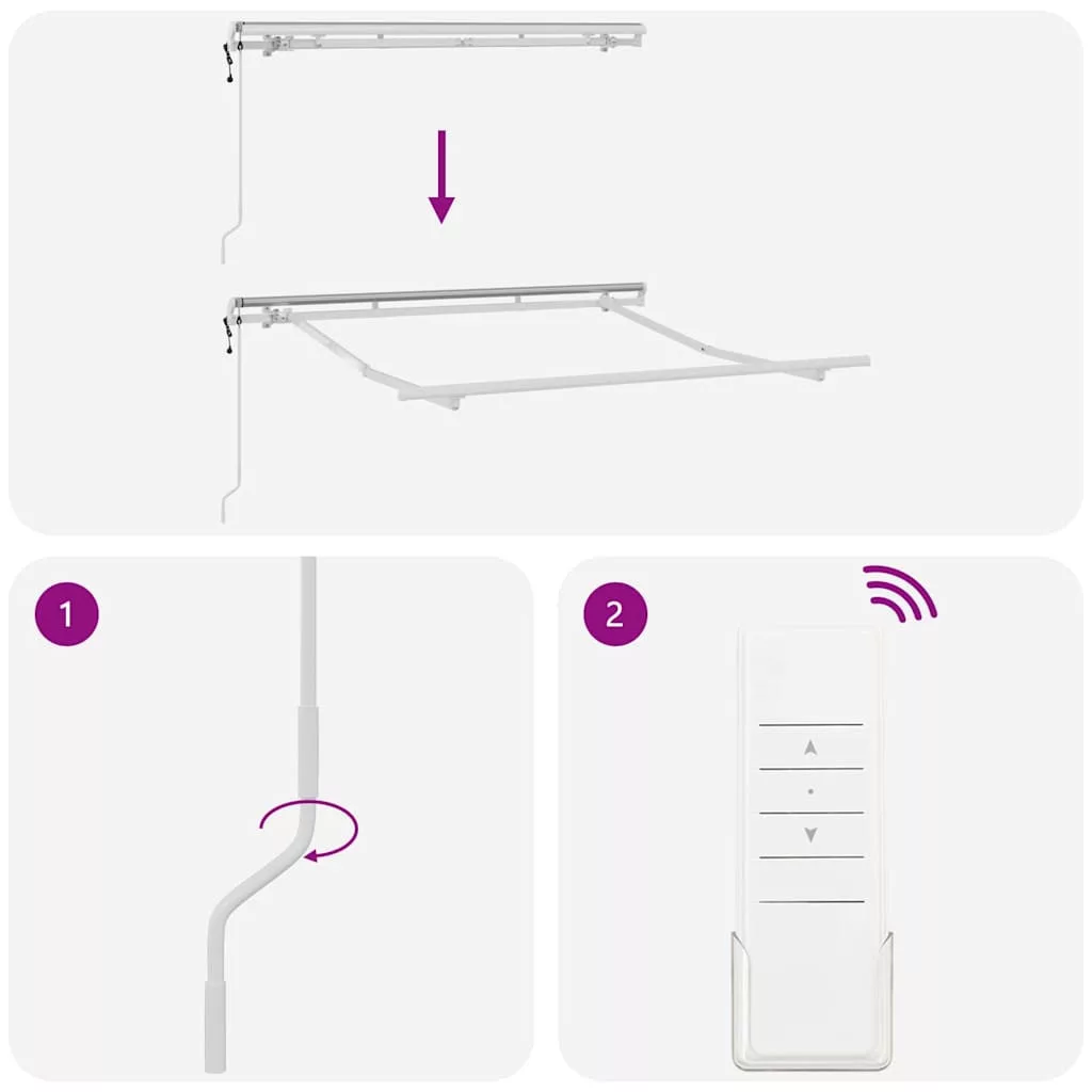 Veszély! Kinyitáskor a rugó erősen kipattan. NE távolítsa el a kötelet addig, amíg az összes összeszerelési lépést be nem fejezte, az összes csavart nem rögzítette és az elem nincs a falhoz rögzítve! Figyelem! Legyen óvatos a karok kilazításakor, mert azok feszültség alatt állnak! Az összecsukható kar hirtelen kiengedése sérülést okozhat. Figyelmeztetés: A termék használata előtt el kell olvasni a használati útmutatót. Figyelem: A fagyos körülmények között történő használat kárt tehet a termékben. Külső felhasználás épületeknél és egyéb építkezéseknél. Ne engedje, hogy a gyerekek a redőny vezérlőeszközével játszanak. Tartsa a távirányítót távol a gyermekektől.