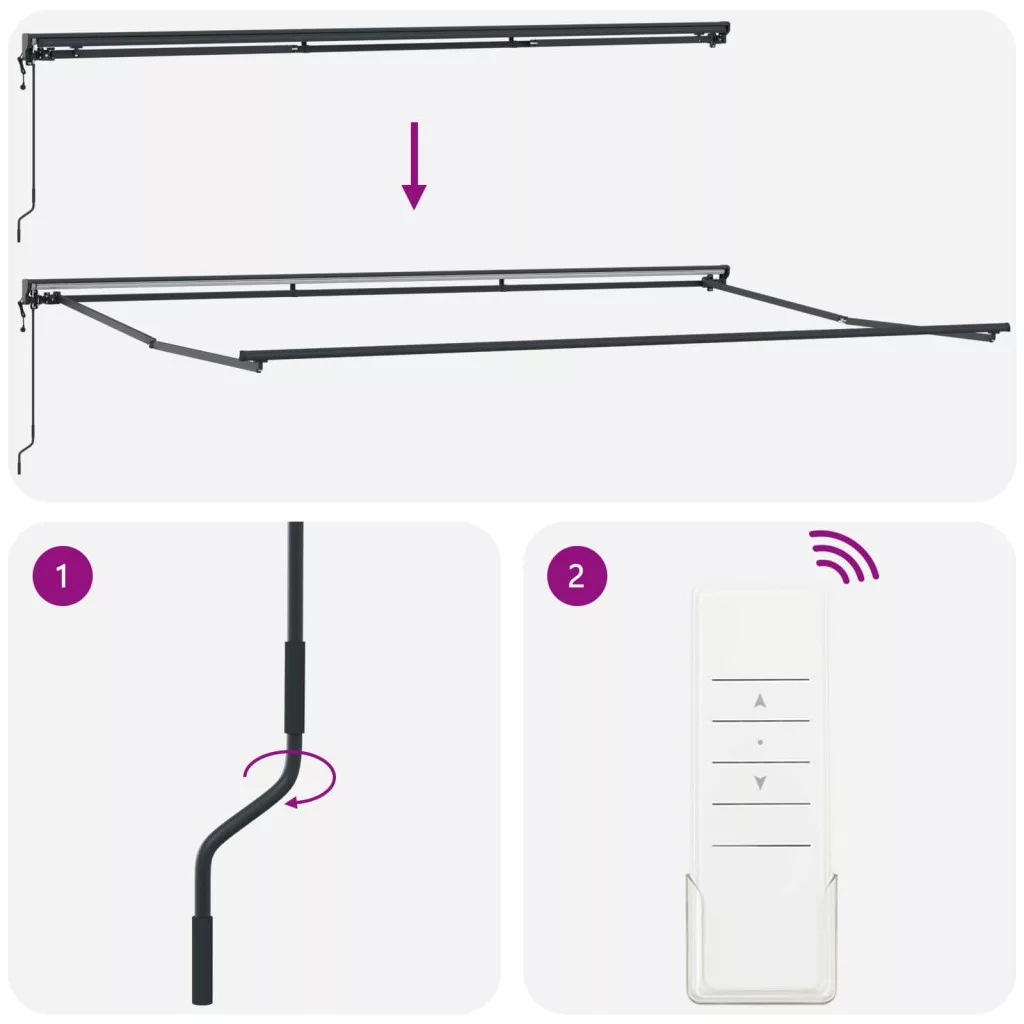 - Állítható működés: A napellenző működtethető manuális kurblával vagy elektromos távirányítóval, így könnyedén kihúzhatod vagy behúzhatod, attól függően, mennyi árnyékra van szükséged.