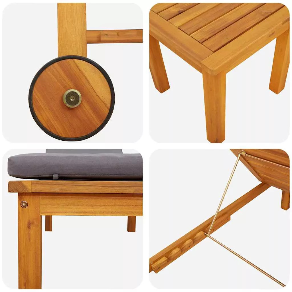 • Tartós akácfa: Az akácfa híres az erejéről és tartósságáról, ez képezi ennek a napozóágy fő anyagát. Robusztus felépítése biztosítja a stabilitást és a hosszan tartó használatot kültéren. A fa természetes szépsége elegáns megjelenést kölcsönöz, ami jól passzol a növényekhez a kertekben és teraszokon.