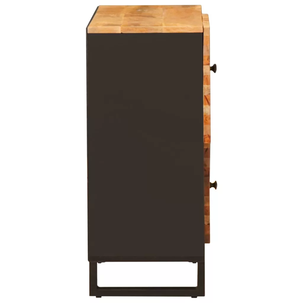 - Belső alkatrészek: keret és lábak A robusztus tömör mangófából készült keret stabilitást ad a szekrénynek. Stílusos fekete lábai emelik a bútort, elegáns érzetet kölcsönözve, miközben a dizájn kifinomult marad.